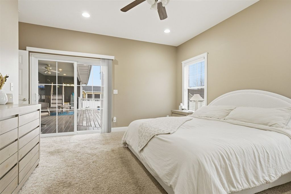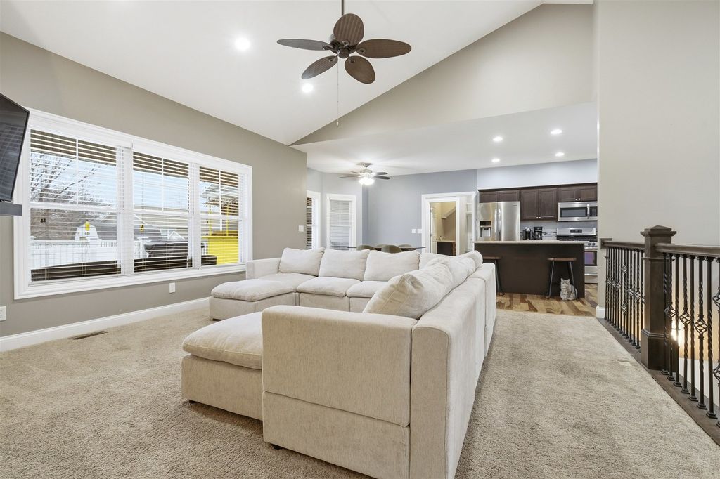 Welcome to this stunning split ranch in desirable Carriage Hills! From the moment you step inside, you'll appreciate the open floor plan and soaring vaulted ceilings. The beautifully appointed kitchen features a large island, granite countertops, and stainless appliances - perfect for everyday living and entertaining alike. The spacious primary suite offers a true retreat: a luxurious bath with separate shower and soaking tub, dual vanities, and a walk-in closet. A sliding glass door opens directly to the large back deck. Two additional bedrooms, a full bath, and first-floor laundry round out the main level. Above the oversized 2-car garage, you'll find a private bedroom and full bath - ideal as a guest suite, teen retreat, or home office. The finished lower level delivers even more with a 5th bedroom, full bath, large family room, gym, and additional unfinished storage space. Outside, enjoy a generous deck and backyard with above-ground pool. PLUS: owned solar panels give you real control over your energy costs. Don't miss this one - versatile, move-in ready, and loaded with space for every lifestyle!