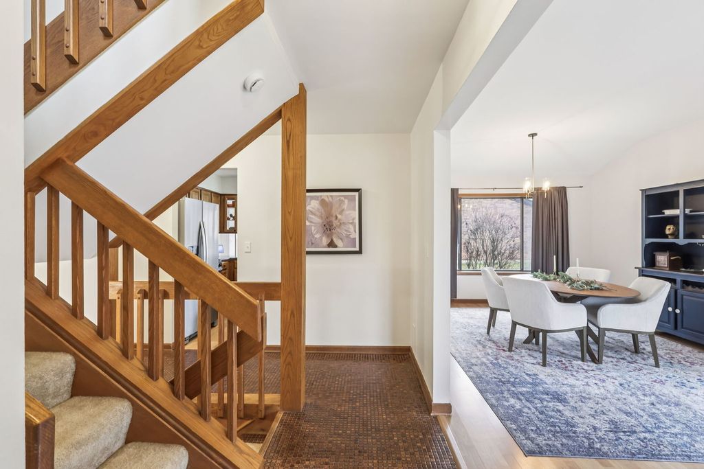 Welcome to this stunning end-unit townhome in Elgin, where spacious living meets modern comfort. As you enter, you are greeted by a formal living and dining area featuring durable wood laminate flooring and a neutral color palette that complements any decor style. The heart of the home is the large eat-in kitchen, which boasts sleek stainless steel appliances and ample space for casual meals. Adjacent to the kitchen, the cozy family room serves as a perfect retreat with its classic brick fireplace. Efficiency defines the main level, which includes a convenient laundry room with extra closet space and direct access to the two-car attached garage. A well-appointed half bath completes this floor. Upstairs, the expansive primary suite offers a private sanctuary featuring a generous walk-in closet and a dedicated ensuite bath. Two additional nicely sized bedrooms and a full guest bath ensure plenty of room for family or a home office. The living space extends into the finished basement, providing versatile areas for a recreation room, a bonus room, and significant storage. Outside, enjoy the tranquility of your private deck overlooking peaceful views.