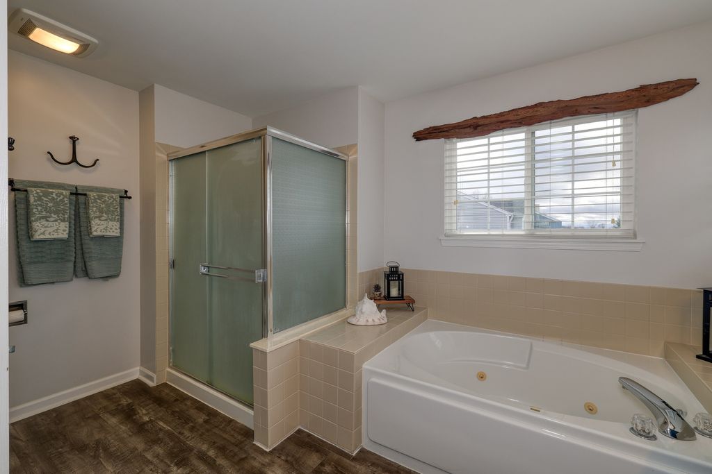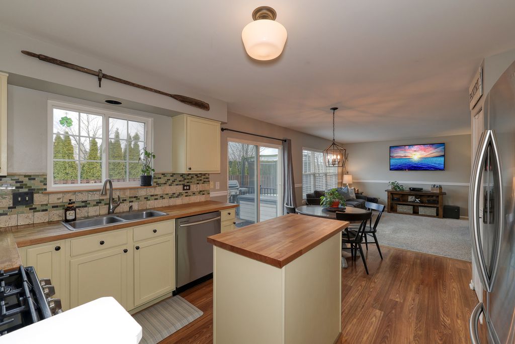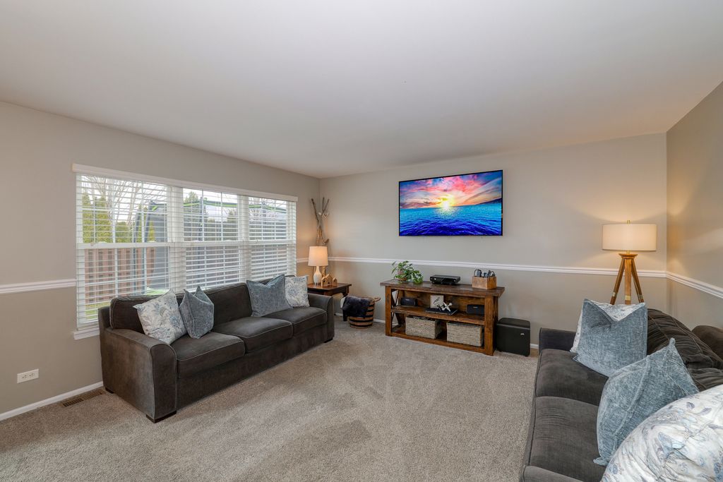 Welcome to this spacious and meticulously maintained 4-bedroom, 2.2-bath home that perfectly blends comfort and style. Nestled on a quiet cul-de-sac, this home offers exceptional curb appeal with new siding, roof, and windows (2018) along with a large, inviting front porch-perfect for relaxing with morning coffee or greeting guests. Step inside to a bright and open floor plan designed for both everyday living and entertaining. The impressive living room features soaring cathedral ceilings that create a sense of openness and natural light. The cozy family room provides the perfect gathering space for movie nights, holidays, or simply unwinding at the end of the day. The kitchen is equipped with stainless steel appliances (2020), ample cabinetry, and convenient access to the first-floor laundry room with washer and dryer (2019) for everyday ease. Upstairs, the primary suite serves as a private retreat, featuring two spacious walk-in closets with custom built-ins and a luxurious ensuite bath with double vanities, a relaxing Jacuzzi tub, and plenty of space to unwind. The finished basement offers additional living space ideal for a recreation room, home theater, workout area, or playroom, along with a convenient half bath. Step outside and enjoy the maintenance-free Trex deck, perfect for summer barbecues and outdoor gatherings. The fully fenced backyard (2019) provides privacy and plenty of space for pets, gardening, or outdoor activities.
