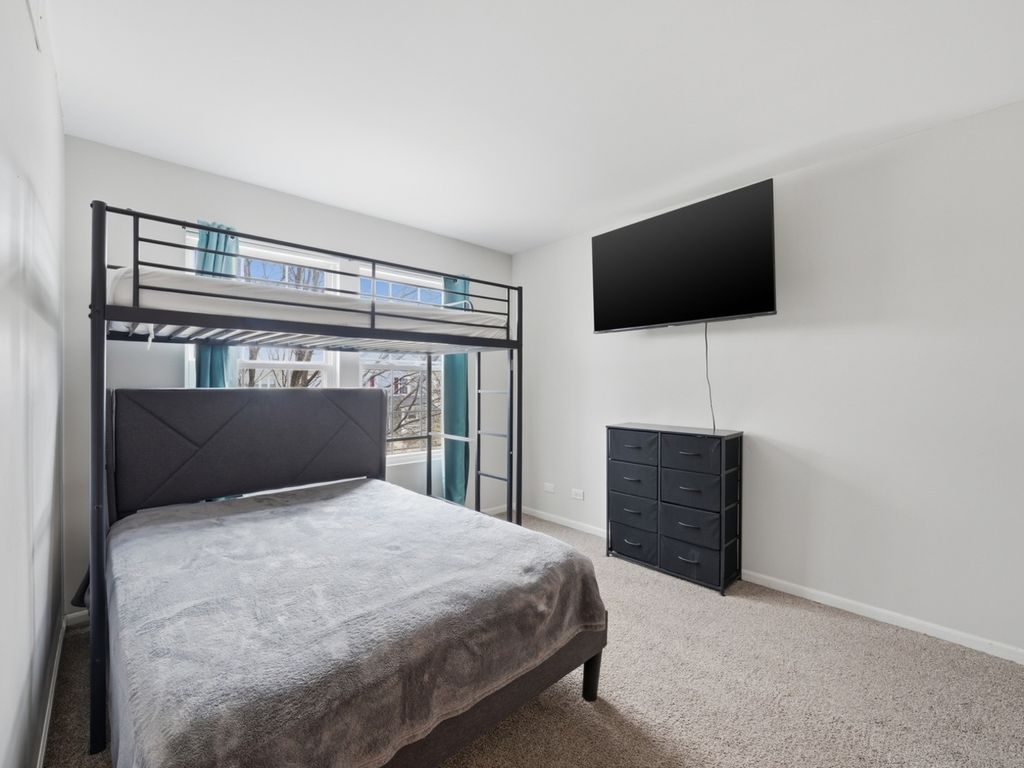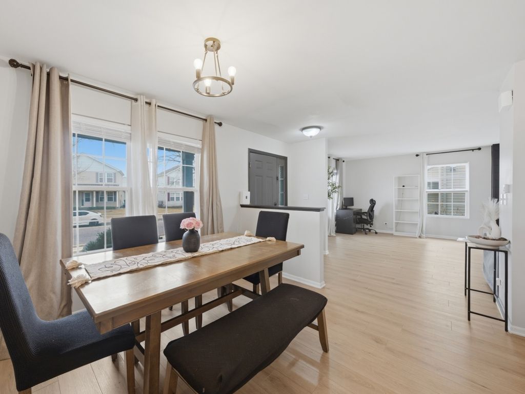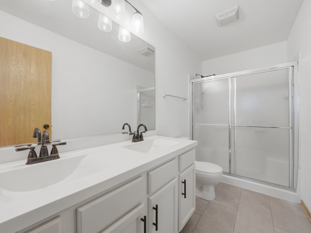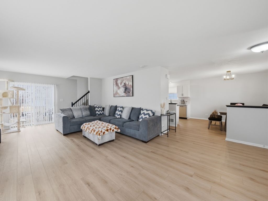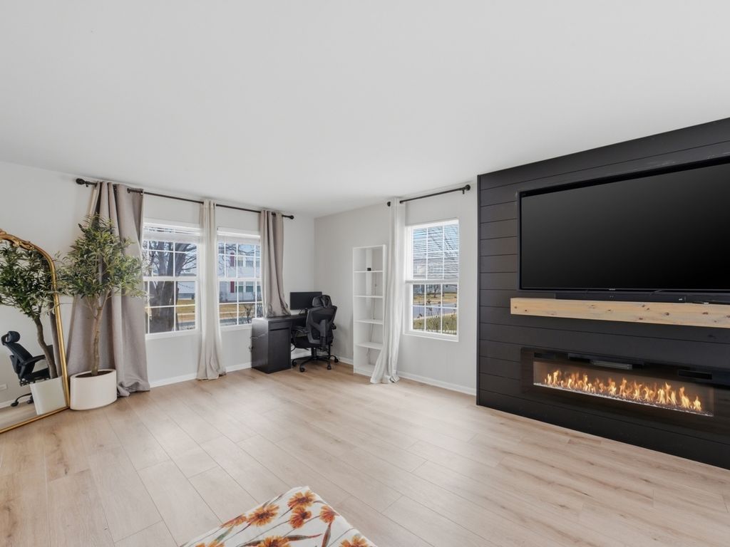This is it! Perfectly situated in a sought-after, family-friendly neighborhood directly across from the park, this 3-bedroom, 2.5-bathroom home is a true gem. The open-concept floor plan is bathed in natural light, featuring soaring windows and a seamless flow designed for both entertaining and daily life. The main level makes a sophisticated statement with a sleek electric fireplace in the oversized living room. At the heart of the home, the kitchen shines with crisp white cabinets, premium quartz countertops, and stainless steel appliances. Upstairs, you will find two generously sized bedrooms, a full guest bathroom, and the convenience of a second-floor laundry room. The primary sanctuary is a true retreat, offering a large walk-in closet and a private ensuite with a solid stone double vanity. Below, a large, versatile basement offers endless possibilities for a home gym, family room, or quiet office space. Freshly painted from top to bottom and move-in ready-simply move in and enjoy.