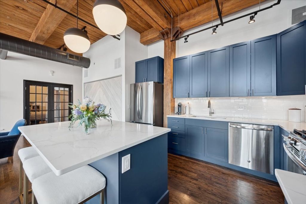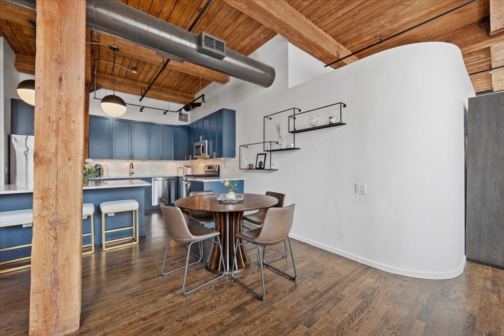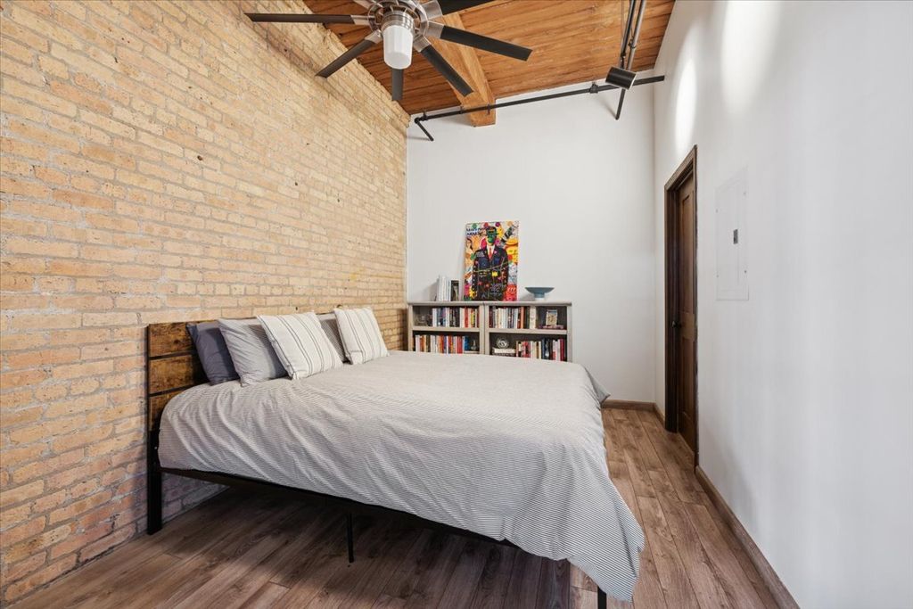 Located in the heart of the West Loop, this one-of-a-kind, spacious, northeast corner timber loft is a rare find featuring 13' ceilings, exposed brick, and TONS of windows lining the north and east walls that fill the home with natural light and showcase both city skyline views and the vibrant restaurant and retail row below. This home offers a split-bedroom layout with two fully enclosed bedrooms, two bathrooms, a separate den, hardwood floors throughout, and a foyer providing a formal entry. The foyer leads to an open-concept kitchen & living space, perfect for entertaining. The spacious living room is centered around the gas fireplace and offers access to a recessed terrace through both a glass door and original factory door. The dining area flows seamlessly into a well-appointed kitchen with newly updated cabinetry (2025), center island with a breakfast bar, quartz countertops, subway tile backsplash, stainless steel appliances, and wine cooler. The primary bedroom includes a walk-in closet and a renovated bathroom with floating dual vanity, built-in medicine niche, and a double shower with bench and handheld spray, plus an additional closet. The second bedroom is also fully enclosed and features an attached bathroom (also access from the hallway). Additional features include in-unit washer and dryer, one garage parking space on the first floor (deeded separately but included in the price) and a storage locker. Building amenities include a 24-hour doorman, on-site manager and maintenance staff, package receiving, party room, and common sundeck. Fabulous West Loop location, close to transportation, expressways, restaurants, shopping, grocery stores and everything the West Loop has to offer!