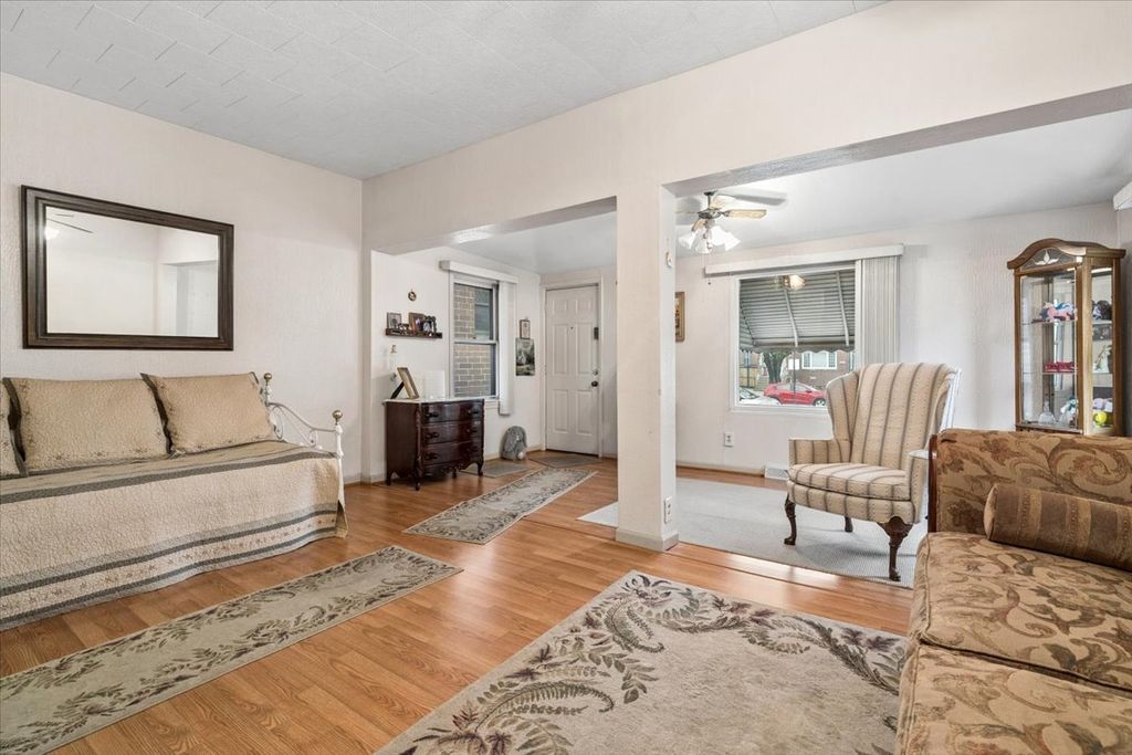 Opportunity awaits in this classic Chicago bungalow located in the desirable Dunning neighborhood. This home offers 2 bedrooms, 1.1 bathrooms, and approximately 1,523 square feet of living space with great potential for updates and personalization. The main level features a spacious living and dining area with wood laminate floors and a functional layout that flows into the eat-in kitchen with ample cabinet space and room for a full dining table. A generously sized bedroom and full bathroom are located on the main level, while the second floor offers an expansive primary bedroom retreat with a half bath and flexible space that could accommodate a sitting area, office, or additional storage. The large basement provides excellent storage and potential for future finished living space. Situated in Chicago's Northwest Side, the home is close to neighborhood parks including Hiawatha Park, shopping and dining along Irving Park Road and Harlem Avenue, and offers convenient access to public transportation, O'Hare Airport, and major expressways for an easy commute into downtown Chicago.