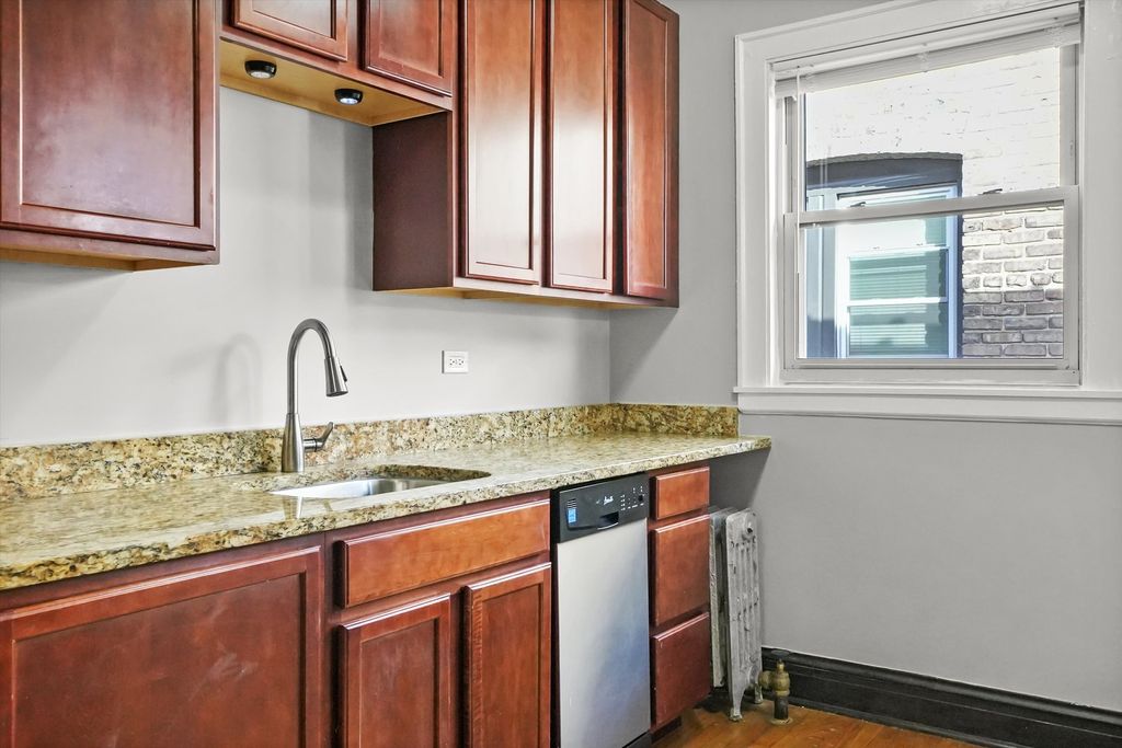 Condo quality spacious 1br with great layout! Unit features: granite counters, 42" cabinets, hardwood floors, dishwasher & microwave, and space for a small dining room table. Responsive maintenance staff, and beautifully landscaped courtyard. Laundry on-site. Free street parking, and municipal parking lot one block south with parking spaces for rent (45 dol./quarter, 150 dol./year). Heat and water included! Don't miss this! Available April 1st!