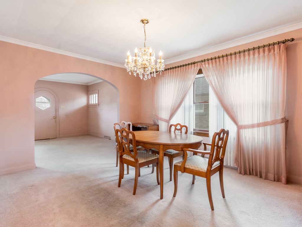 Adorable brick 2 bedroom, 2 bath bungalow that includes a side drive with a detached 1-car garage. Old-time charm with large front porch allowing time to pass by while soaking in the summer sun in the upcoming months. Chateau styled front entryway that's set for a fairy tale. Separate formal living room and dining room. Crown molding and cove archway separates the rooms. The kitchen has 32" oak cabinets/knobs & handles/appliances and has a small breakfast nook. Both bedrooms have good sized closets (exposed original hardwood floors) & ceiling fans. Full, finished basement has additional room (possible 3rd bedroom), family room, full bathroom and laundry/storage area. HVAC under 10yrs, HWT 2010. Windows have been replaced.