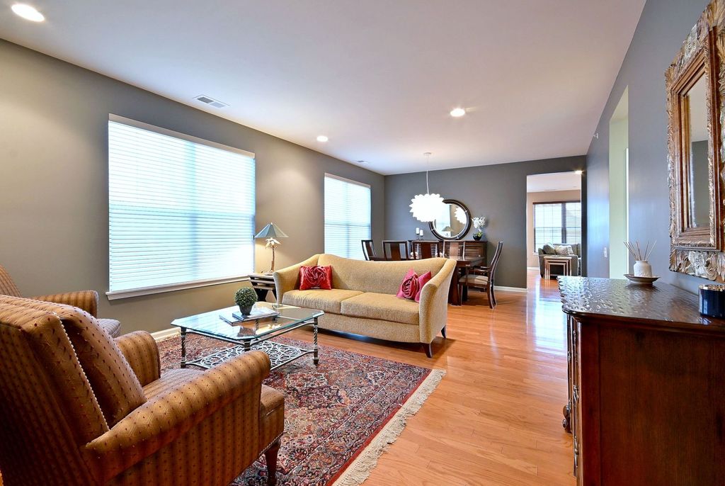 Welcome home to this beautifully maintained, sun-filled home offering comfort, style, and easy living. The open floor plan of this Potomac Model features hardwood floors throughout the Living Room, Dining Room, Kitchen, and Family Room, creating a warm and inviting space perfect for both everyday living and entertaining. The spacious kitchen is the heart of the home, showcasing 42" cherry cabinets, stainless steel appliances, and a bright eating area that leads to a charming brick paver patio-ideal for enjoying morning coffee or relaxing outdoors. The kitchen flows seamlessly into the Family Room, allowing for effortless conversation and gathering. The Primary Suite provides a peaceful retreat with beautiful bay windows, a large walk-in closet, and a private en suite bathroom. The second bedroom has a full hallway bath just outside of it. The den/office is privately located away from the main living area. The windows in many of the rooms have upgraded blinds with privacy sheers to let the light in. The Laundry Room which includes a newer washer and dryer, is located just off of the finished garage which has durable epoxy flooring, and a wall of cabinets providing for exceptional storage space. Situated on a premium corner lot on a cul de sac like street, the home also offers added privacy and attractive curb appeal. Lovingly cared for and in great condition, this home is being sold As-Is. Located in sought-after 55+ Sun City by Del Webb active adult community, residents enjoy a vibrant lifestyle with access to clubhouses, swimming pools, tennis courts, golf course, scenic walking trails, and a variety of social clubs and activities. Conveniently located to shopping, restaurants and I-90. This welcoming neighborhood is ideal for those seeking an active and peaceful lifestyle.