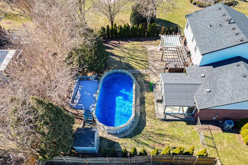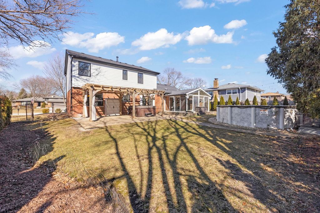 Move-in ready 4 bedroom, 2.5 bathroom home with the ultimate backyard in Darien's Farmingdale Village and sought-after school district. Curb appeal stands out with classic brick exterior, clean lines, and a welcoming front entry. The oversized driveway offers plenty of additional parking alongside the attached two-car heated garage with epoxy floor and custom cabinets and workbench. Inside, bright living and dining areas provide comfortable everyday space with great natural light and neutral finishes throughout. The kitchen features granite countertops, stainless steel appliances, white cabinetry, and generous prep space. It opens easily to the main living areas, making it ideal for both daily living and entertaining. The family room adds character with a vaulted ceiling, exposed beam, and a striking stone fireplace accent wall. Just off the family room, the sunroom offers flexible space filled with natural light and backyard views, perfect for warm summer evenings or cool fall mornings. Upstairs, the master bedroom includes double closets and a nicely updated ensuite bathroom. The 3 secondary bedrooms are generously-sized and served by a modern hall bathroom. The finished basement provides additional living space for a rec room, home office, or gym, plus a dedicated laundry area and storage. Out back, enjoy a fully fenced yard complete with a paver patio, pergola, hot tub, and pool designed for relaxing or entertaining. // UPDATES: Sump Pump and Updated Plumbing (2026), Hot Water Heater (2022), Garage Floor Epoxied (2022), Roof (2021), Siding (2021), Windows (2021), 2nd Floor Bathroom Walk-In Shower (2021), Extended Driveway (2021), Kitchen Remodel including Oven, Refrigerator, Microwave (2017), Washer & Dryer (2017), All Bathrooms Remodel (2017), Main Floor and Basement Flooring (2017)