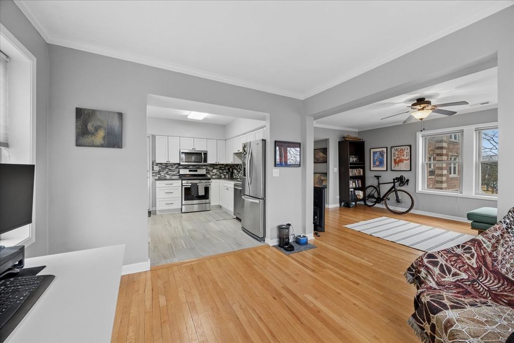 Sun-filled condo in the heart of downtown La Grange! This beautifully updated 1-bedroom home combines vintage charm with modern upgrades, surrounded by the restaurants, cafes, shops, parks, grocery stores, and local favorites that make downtown La Grange such a sought-after place to live. Commuters will appreciate the close proximity to the Metra station, offering a quick 22-minute ride to downtown Chicago. Inside, the bright interior is freshly painted and completely move-in ready, with gorgeous hardwood floors throughout most of the home. The beautifully remodeled kitchen features high-quality stainless-steel appliances, a stylish backsplash, and generous cabinet space, along with the convenience of an in-unit washer and dryer located just off the kitchen. The layout flows effortlessly from the kitchen into a spacious dining area with views of downtown La Grange, and continues into a large, welcoming living room that is ideal for relaxing or entertaining. The bedroom offers a peaceful retreat with blackout blinds and the quiet comfort of this well-maintained vintage building. Additional features include all new windows installed in 2021 that bring in incredible natural light, a beautifully updated bathroom with elegant tile finishes, a large private storage unit, new A/C in 2023, and access to a bike room and laundry room within the building. Parking is convenient with Village of La Grange permit parking across the street, with both covered and uncovered options available. Opportunities like this in downtown La Grange rarely last-schedule your showing today & move in just in time for farmer's market season right outside your front door!