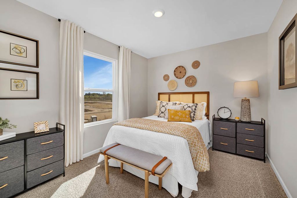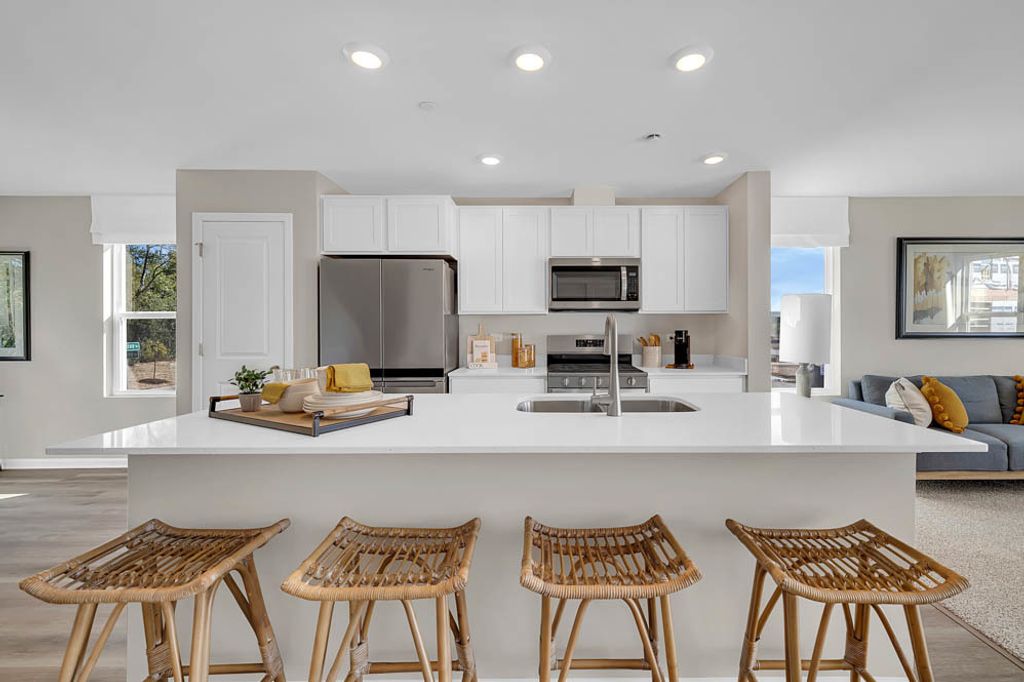 Find yourself at 873 Briar Glen in Hampshire, Illinois, a beautiful new home in our Prairie Ridge community. This townhome will be ready for a December move-in! Homesite includes a fully sodded yard that is maintained throughout the year as well as snow removal in the winter. This end unit Garfield townhome plan offers 1,756 square feet of living space with 3 bedrooms 2.5 baths, and a finished bonus room. Walking up to the main level, you will find this home's open concept living space. The expansive kitchen overlooks both the front dining and back great room areas, making it the ideal space to entertain. Step outside onto your balcony, relax and enjoy your morning coffee. Additionally, your kitchen features designer cabinetry, a spacious island with quartz countertops, and pantry. Walking upstairs enjoy your private get away with your large primary bedroom on its own side of the second floor with a en suite bathroom containing a raised dual quartz vanity and walk-in closet. Enjoy the convenience of a second-floor laundry, a second and third bedroom with a full second bath. Luxury vinyl plank flooring throughout the kitchen, bathrooms, and laundry. Designed for the perfect functionality, this community features low maintenance living, with modern 3-story townhome floorplans. All Chicago homes include our America's Smart Home Technology. Photos are of similar home and model home. Actual home built may vary.