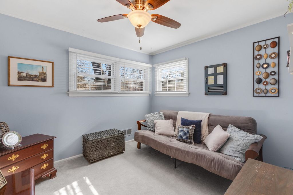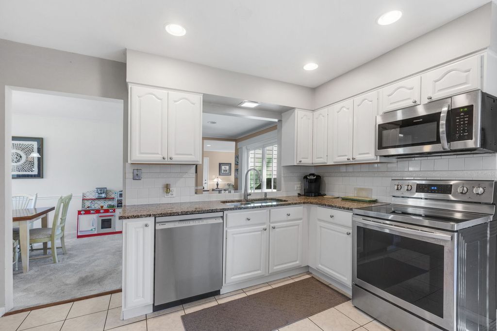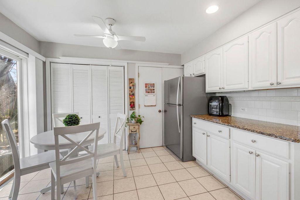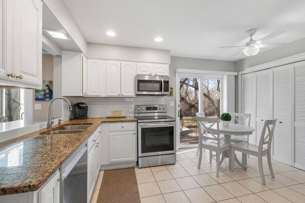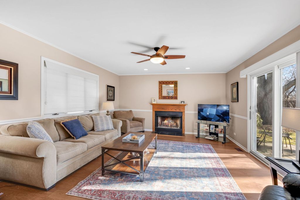 Charming ranch home set on a beautifully landscaped 1/3-acre lot at the end of a quiet cul-de-sac, offering a rare walk-to-town location. Enjoy peaceful neighborhood living with easy access to nearby parks and convenient walking distance to two Metra stations. The welcoming entry opens to a spacious living room featuring neutral decor, crown molding, and a large picture window that fills the space with natural light while overlooking the picturesque cul-de-sac. The eat-in kitchen offers white cabinetry, granite countertops, stainless steel appliances, and space for a table. One of three sliding glass doors provides access to the expansive deck, creating great indoor-outdoor flow. A large laundry closet accommodates a side-by-side washer and dryer with additional storage. Just beyond the kitchen, a breakfast bar leads into the home's addition featuring a generous family room with engineered hardwood flooring, recessed lighting, and a cozy wood-burning fireplace. A sliding door provides additional access to the deck, perfect for entertaining. A full bathroom with tub/shower and white vanity completes this space. The bedroom wing includes three bedrooms, highlighted by a primary bedroom with a walk-in closet. A second full bathroom features a mosaic tile floor, white vanity with marble countertop, and a tub/shower. Step outside to the expansive deck, accessible from three separate sliding doors, overlooking the private and beautifully landscaped 1/3-acre yard-ideal for relaxing or entertaining.