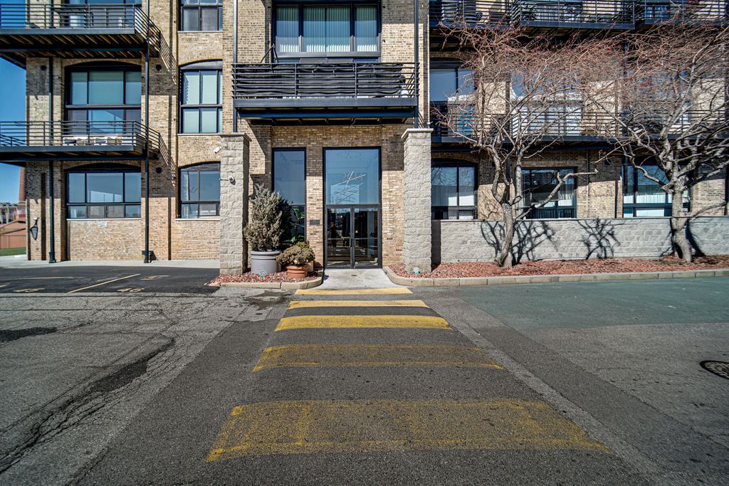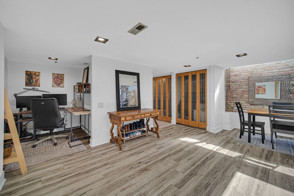 Welcome home to this beautiful 1 bed/1.5 bath loft with a potential second bedroom!! This corner unit boasts 18 foot ceilings, exposed brick, tons of natural light, an open floor plan, new luxury vinyl flooring (2023), with a newly updated kitchen (2023). The kitchen features quartz countertops (2023), matte black shaker cabinets (2023), stainless steel appliances, and large waterfall kitchen island (2023). This home is equipped with a dining area, a separate den space perfect for an office or potential second bedroom, in-unit laundry, and a large living room complete with a wood-burning fireplace. The living room opens up into a large private patio. Upstairs you'll find the primary lofted bedroom with brand new carpet, an ensuite bathroom and large walk-in closet. This unit comes with one gated parking space, new A/C (2024), new furnace (2024), and is perfectly situated near tons of shopping, grocery stores, and is conveniently located near the highway. Come make this loft your home!