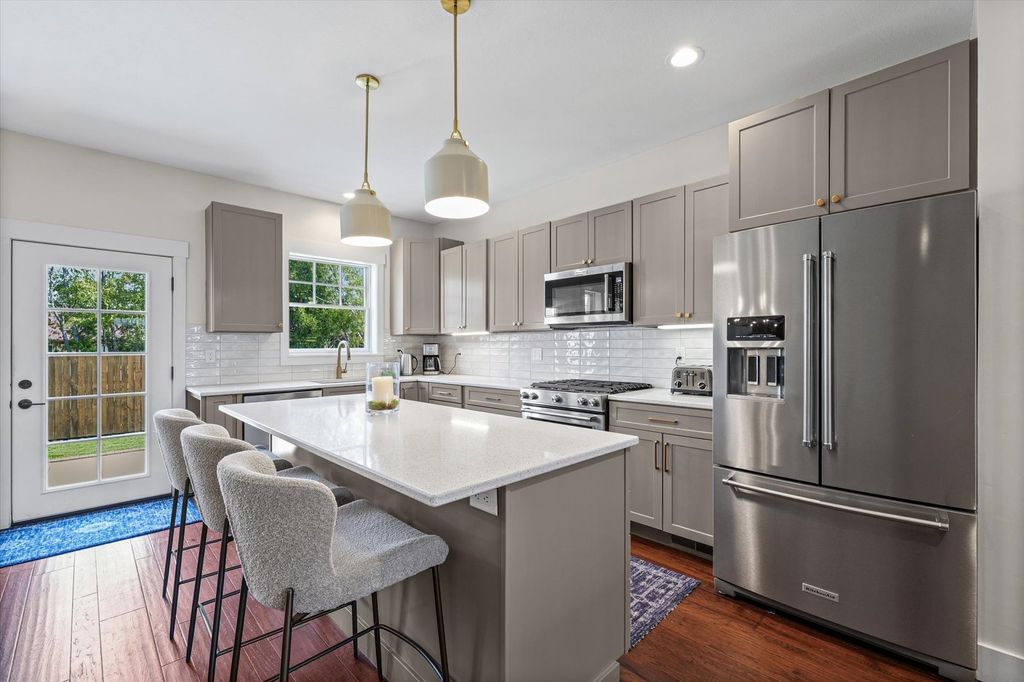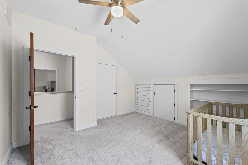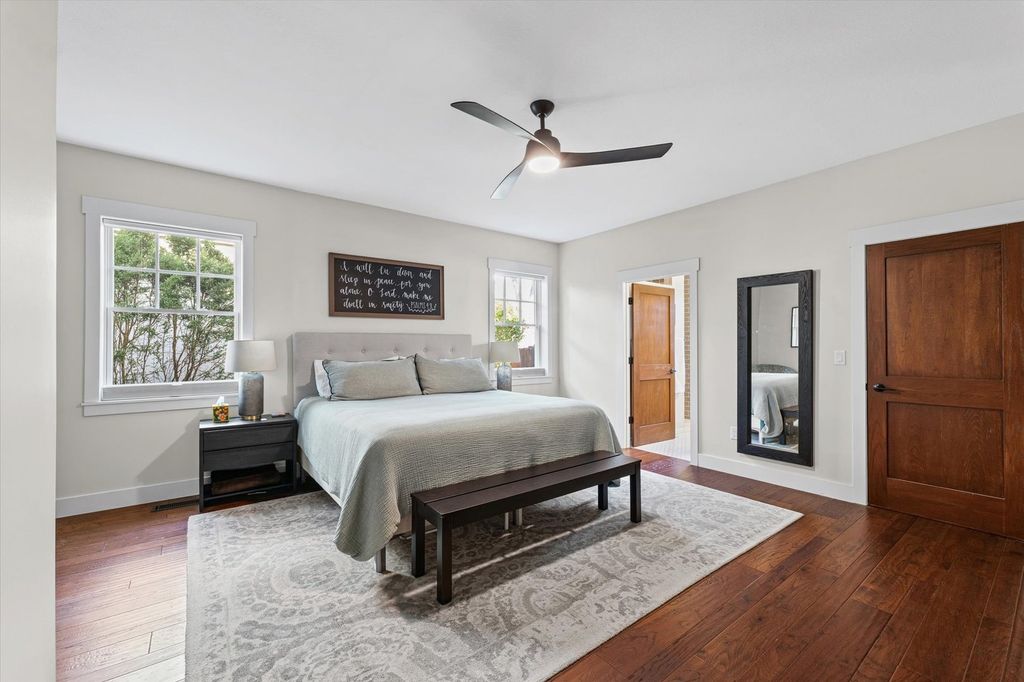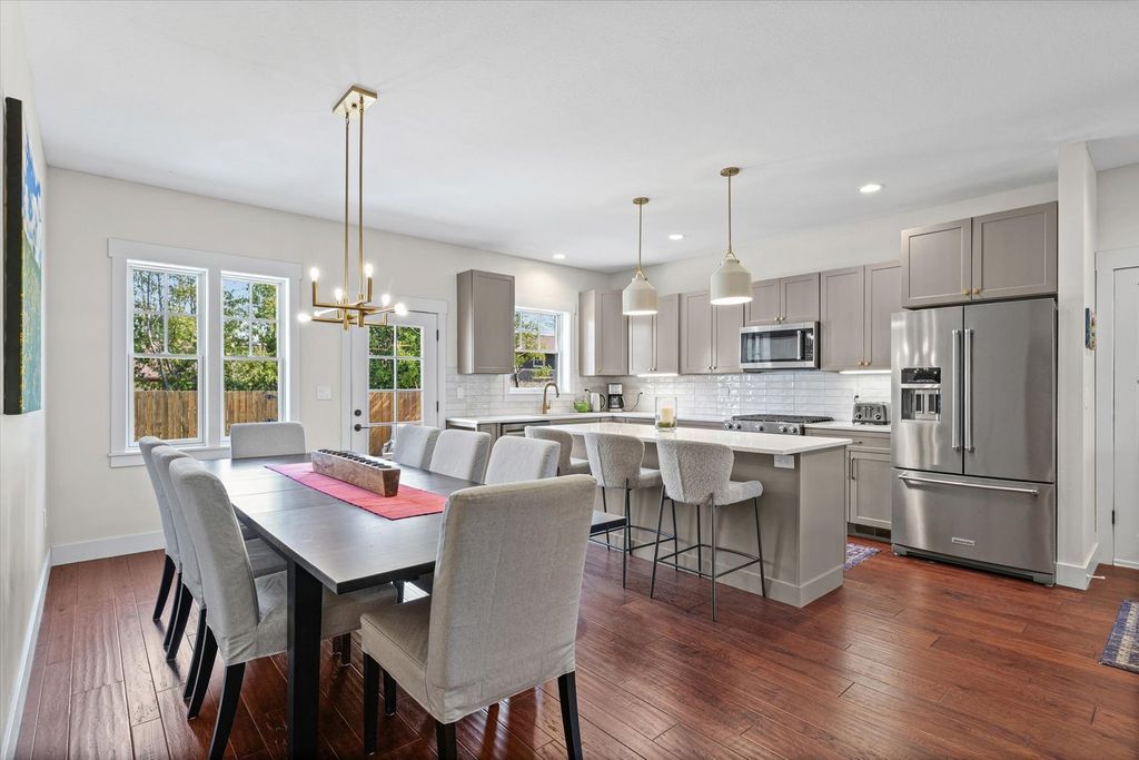 With multiple living spaces, thoughtful improvements, and a flexible layout, this 1.5 story Craftsman-style home truly stands out. Built in 2015 and refreshed in 2023, this 4-bedroom, 3 full bath home offers over 2,500 square feet of comfortable living space with quality finishes throughout. The main level features 9-foot ceilings, hardwood flooring, recessed lighting, and an open layout designed for both everyday living and entertaining. The kitchen, with island and breakfast bar, flows into the dining area and spacious living room. The main floor also has two bedrooms and two full baths, including a primary suite with a walk-in closet featuring custom built-ins and an attached bath with walk-in shower. Upstairs you'll find two additional bedrooms, a full bath, and a family room, offering a great separate living space for guests or hobbies. New carpet was installed throughout the second floor in 2023. Recent improvements include professionally painted interiors, updated light fixtures, Lutron smart lighting, remodeled bathrooms with new cabinetry, quartz countertops, mirrors, and tile, Hunter Douglas blinds, and updated kitchen appliances. Additional features include Hardie board cement siding, Pella vinyl windows, fiber optic broadband service, and an 8-foot privacy fence surrounding the backyard. The 2.5-car garage, backyard patio and basketball pad provide extra room for recreation, storage, and outdoor fun.