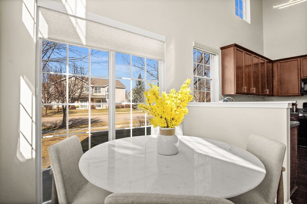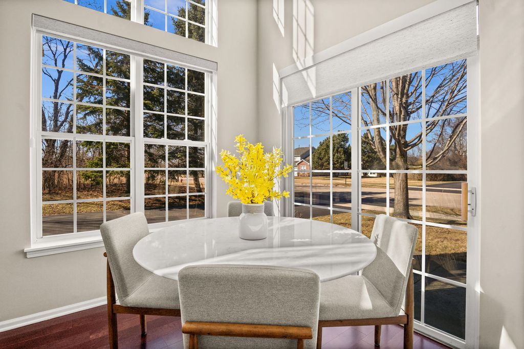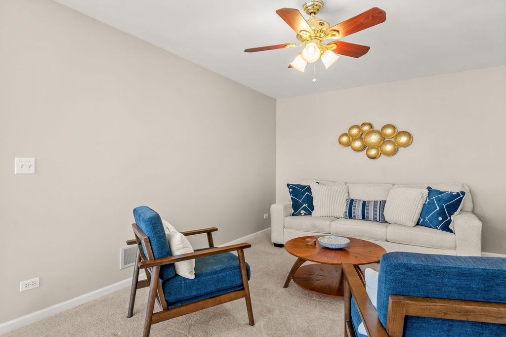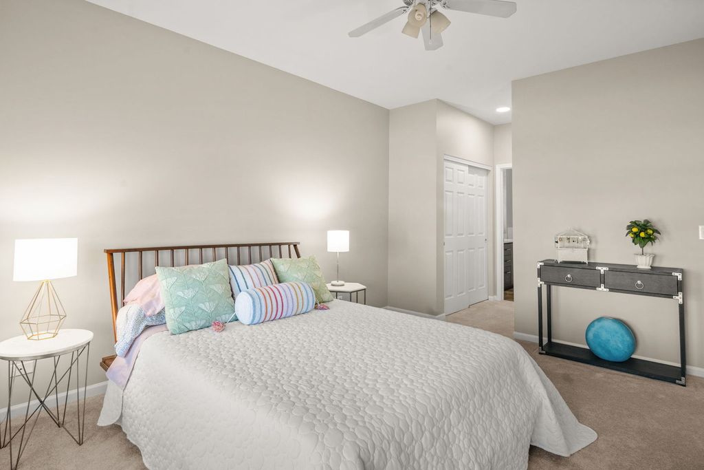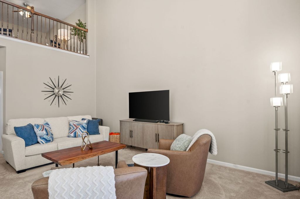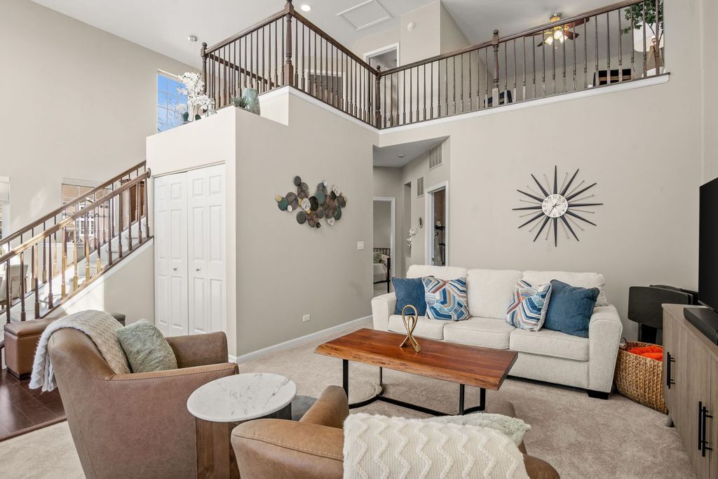 Beautifully updated 2 bedroom, 2.5 bath end-unit townhome in Windsor Pointe offering comfort, style, and an incredibly convenient Sugar Grove location. Situated on a landscaped corner lot, the home welcomes you with a charming covered front porch, private backyard patio, and a 2-car attached garage with a brand new door. Inside, the open floor plan features modern neutral decor, soaring two-story ceilings, and hardwood flooring that create a bright and spacious feel throughout. The huge living room flows seamlessly into the spacious kitchen with 42" cherry cabinetry, new refrigerator, new sink, disposal, and pull-down faucet, plus an adjacent dining area with sliding door access to the patio. The first floor primary suite offers ideal main-level living with a walk-in closet, 2nd closet and private bath featuring a double bowl vanity, soaking tub, and new step-in shower. A convenient first floor laundry room and powder room complete the main level. Upstairs you'll find a massive loft overlooking the living room, perfect for a home office or flex space, along with a second bedroom and full hall bath. Additional updates include new carpet with upgraded padding, fresh interior paint, new light fixtures, motorized blinds in the kitchen, dining, and living rooms, room-darkening blinds in both bedrooms, new vanities and fixtures in both full bathrooms, and a new comfort-height toilet in the powder room. All of this within walking distance to shopping, dining, and everyday conveniences, plus easy interstate access for commuters.