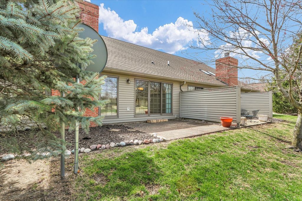 This outstanding 3-bedroom, 2-bathroom, 1-floor condo features a fantastic floor plan highlighted by soaring cathedral ceilings and bright skylights in the spacious living room. A central gas fireplace flanked by double windows creates a warm focal point, flowing naturally into a kitchen equipped with cherry-finish cabinetry, hardwood floors, and an incredible amount of storage. The attached dining room offers easy access to a private patio, perfect for outdoor relaxation. Retreat to the primary suite, which features a walk-in closet and a private bath with a double vanity and a stand-up tiled shower. A versatile third bedroom serves perfectly as a den or study, while the layout is rounded out by a separate laundry area, multiple storage closets, and an attached two-car garage.