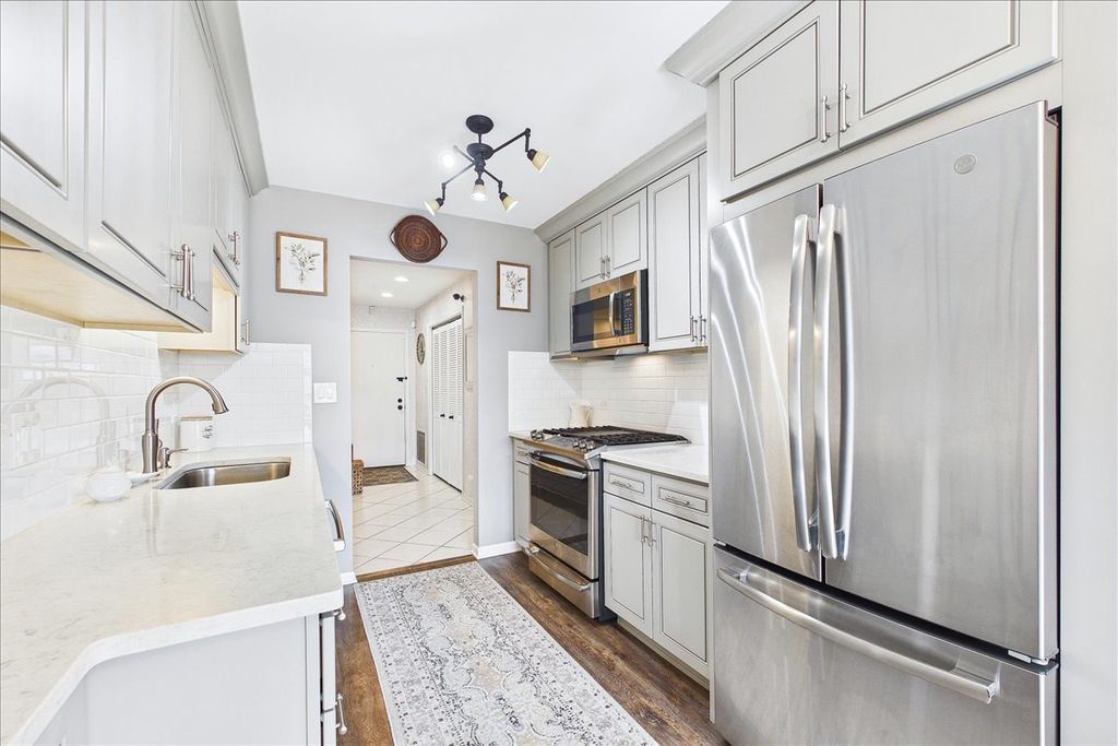 Effortless living in peaceful low maintenance, professionally managed condo building in Buffalo Grove. 3rd floor end unit provides sunlight from both East and South exposures. New luxury vinyl flooring thruout. Renovated white kitchen with top of the line appliances, quartz counter top, tile floor, gorgeous backsplash and room for table and chairs with access to balcony. Family room and kitchen have balcony access. Living room and dining room create an inviting open space. Family room has gas log fireplace and recessed lighting. The spacious primary suite is complete with large walk-in closet and private bathroom with 2 sinks, tub and separate shower. 2nd bedroom is across from full hall bath. Newer windows, and mechanicals. 2 spaces in heated garage. No rentals and no pets. Outdoor pool and indoor hospitality room. Interior painted throughout (2022-2023). Front entrance exterior renovated (2025). Shopping carts are conveniently located in the garage for all residents' use. Community room with a small kitchenette and bathroom is available on the first floor to reserve. Storage room in garage with floor to ceiling storage cage for each condo owner. Garbage chute on each floor by elevator. Moves - Mon-Sat 8am-6pm. Must reserve elevator so it can be padded. Gas shut off available on each floor for each unit. A/C unit on roof. Access is available for inspector in the stairway by the unit. Furnishings may be available for purchase separately.