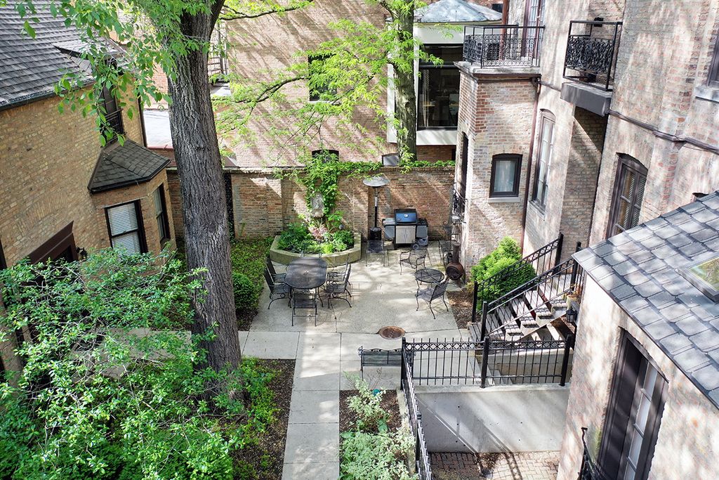 Tucked away within a serene, landscaped courtyard, this rarely available two-story coach house offers a private retreat in the heart of Chicago's coveted Gold Coast. Featuring 1 bedroom and 1.5 bathrooms, the home blends historic neighborhood charm with recent modern updates and true city convenience-just steps from the lakefront, beaches, Michigan Avenue, parks, dining, shopping, and nightlife. The main level showcases soaring ceilings, an open and airy layout, and abundant natural light from oversized east-facing windows overlooking the private gated courtyard. A thoughtfully designed kitchen renovation anchors the space with sleek white cabinetry, stone countertops, high-end stainless steel appliances, island seating, and generous storage, complemented by a convenient first-floor powder room. Upstairs, the expansive primary suite includes space for a home office, a professionally organized walk-in closet with additional loft storage, and a contemporary en-suite bath with a tiled walk-in shower and heated tile flooring. A charming Juliet balcony enhances the upper level with courtyard views and sunlight, nearby parking options, and excellent transit access complete this home that truly lives like a private single-family residence in one of the city's most desirable locations.