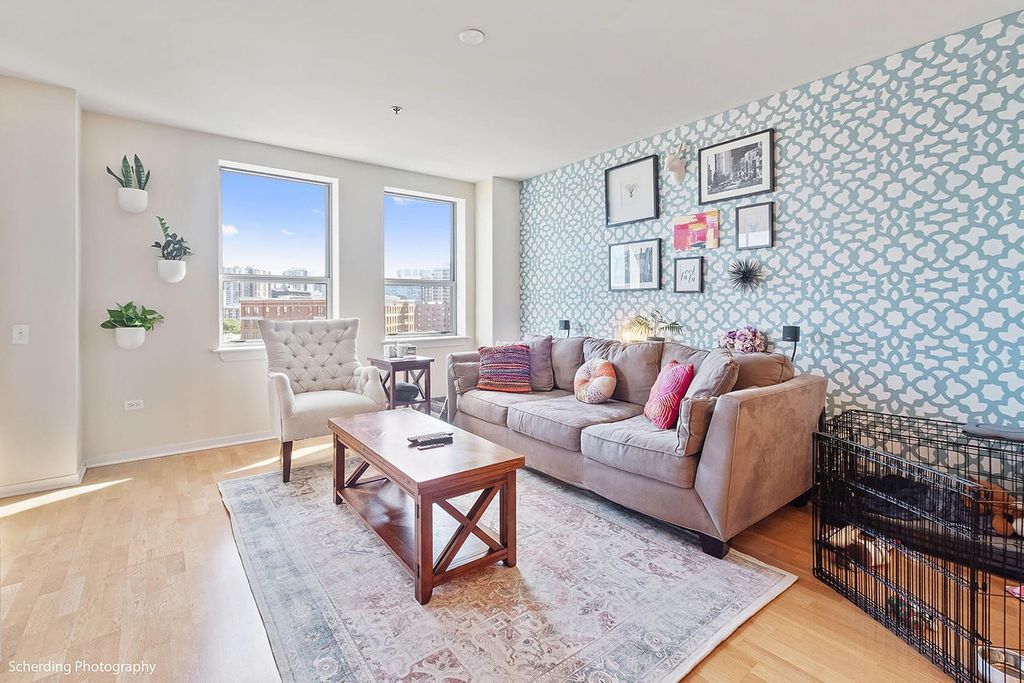 In Old Town! This loft offers impressive views to the East, North, and West, including tree tops, historic buildings, and lakefront high-rises. It's conveniently close to Wells Street, within minutes of the Gold Coast, Streeterville, Lincoln Park, and Wicker Park. The building is relatively new, featuring high concrete ceilings for the loft effect, with fully enclosed walls for privacy and noise control, including an exterior window in the bedroom. The unit has hardwood floors, central air conditioning and in-unit laundry. The floor plan is open, with a large kitchen island that's great for day-to-day living and entertaining. A separate den can be used as an office, dining room, guest room, or other flexible space, according to your needs. The private deck is large and set back for more privacy and less exposure to noise and wind, and you're allowed to have a grill. The price includes one garage parking space. Surrounded by amenities, including grocery stores like Jewel, Aldi's, Target, and the new Dom's Market, coffee shops like Starbucks, Philz, La Colombe, Dollop, and many restaurants, pubs, and shops. It's next to Sewer Park and near the lakefront beaches, bike and running trails. Public transport is readily accessible with the Red Line (Clark/Division), Brown Line (Sedgwick & Chicago Ave), multiple bus lines, and Divvy bike stations nearby. A solid choice in the heart of the city. Solid building with strong reserves, investor friendly building with no rental cap or rental restrictions.
