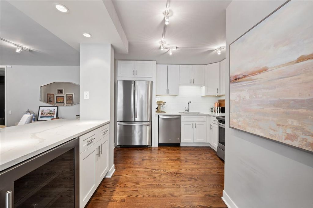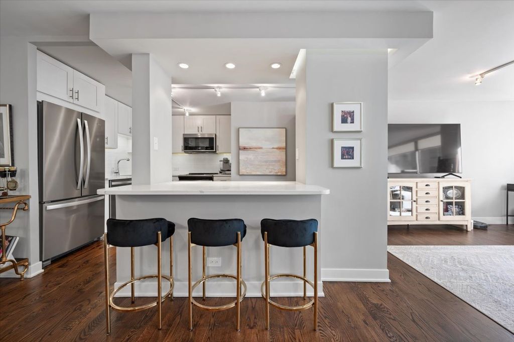 Ideally located just off Michigan Avenue's iconic Magnificent Mile, this beautifully renovated residence offers the best of Gold Coast living in an intimate Boutique setting. A recent, top-to-bottom renovation has created a Modern yet Classic aesthetic - timeless, refined, and effortlessly livable. The Open-Concept floor plan, highly sought after by today's buyers, feels both spacious and welcoming, with a dedicated Dining area that easily accommodates everyday living or entertaining. A full wall of South-facing windows fills the home with warm natural light while framing views of Chicago's iconic landmarks. Wide-plank solid Oak hardwood floors flow seamlessly throughout, adding warmth and continuity to the space. The Kitchen is bright, modern, and thoughtfully designed, featuring white cabinetry, deluxe stainless-steel appliances, white Quartz countertops, and a striking full-height glass backsplash. A generous Quartz Island serves as both a focal point and a gathering place, comfortably seating four, while a built-in Wine refrigerator adds a touch of everyday luxury. Storage is abundant, with well-planned closets throughout, complemented by modern LED lighting and clean trim details. The Bedroom is generously sized and serene, offering a full wall of closets, an additional Linen closet, large windows, and beautiful Southern light. The Bathroom is refined and comfortable, finished with a white vanity topped in Quartz, granite flooring, and an oversized, all-granite walk-in shower is both luxurious and spa-like. A standout feature is the IN-UNIT Bosch Washer and Dryer, not found in every home, adding exceptional convenience. 110 East Delaware is a Boutique, Smoke-Free, Pet Friendly building, known for its oversized residences with only four homes per floor. Amenities include...24-Hour Door Staff * On-Site Management * Garage Parking for residents and guests * Bicycle Storage * and a Community Laundry Room. The location is truly unmatched. Just outside your door are The Four Seasons Hotel, The Shops at 900 Michigan, Bloomingdale's, and Equinox Gym and Fitness Club. You are moments from the Lakefront, Oak Street Beach, parks, dining and popular restaurants, groceries, art and theatre, casual and luxury shopping and the vibrant energy of the Magnificent Mile. AN EXCEPTIONAL HOME IN AN EXCITING LOCATION - THERE IS MUCH TO ENJOY.