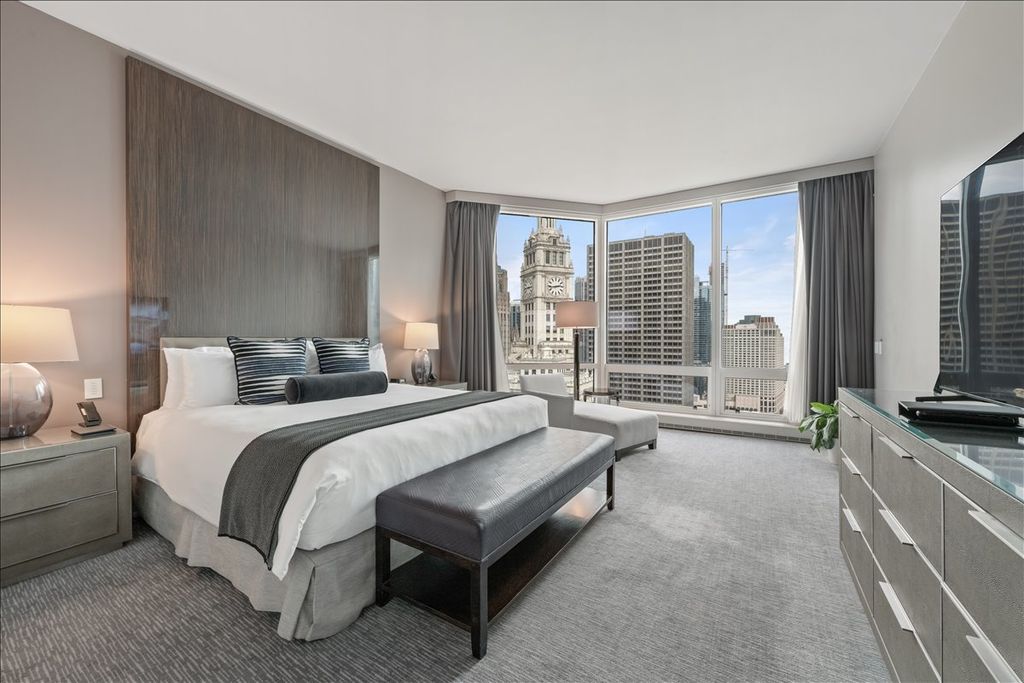 Largest two-bedroom hotel suite available at Trump Tower, offering spectacular east-facing views of Lake Michigan and the Chicago skyline through expansive floor-to-ceiling windows. This spacious hotel suite combines luxury hotel living with the comfort of a private residence. The well-appointed kitchen features Snaidero cabinetry, granite countertops, and premium stainless-steel appliances by Miele and Sub-Zero, creating a sleek and functional space for extended stays or entertaining. Elegantly furnished and professionally maintained, the suite provides a turnkey opportunity for owners seeking both personal use and participation in the hotel rental program. Enjoy access to world-class, five-star amenities, including a full-service health club and spa, indoor heated pool, room service, concierge, and on-site dining and lounge options. Located in the heart of River North along the Chicago River, the property offers immediate access to Michigan Avenue, world-class shopping, dining, and entertainment, making it an exceptional opportunity to own a luxury hotel residence in one of Chicago's most recognizable towers.