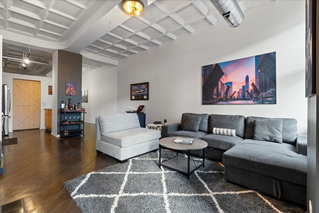 Bright and sunny split 2 bedroom 2 full bath at historic art deco Film Exchange Lofts built originally for Warner Brothers. 11 foot Coffered ceiling, gas fireplace, diagonal hardwood floors, huge windows and balcony - kitchen with stone counters, stainless steel appliances and over-sized island - Separate utility room with stack/washer dryer. Primary bedroom has walk-in closet - Double bowl vanity and separate shower in primary bath. Prime parking space #23 on first level of heated garage additional $35K. Investor friendly and no rental cap. Perfect location. Close to all public transportation, City parks, playgrounds, South Loop Elementary, British, Old St. Marys, Daystar & Jones College Prep schools. Walk to Loop, Target, Jewel, Marianos, Trader Joes, Whole Foods, Roosevelt Collection movies, shops, museums, Grant/Millennium Parks and Lake Michigan. Easy access to all highways 90/94, 55, 290 and Lake Shore Drive
