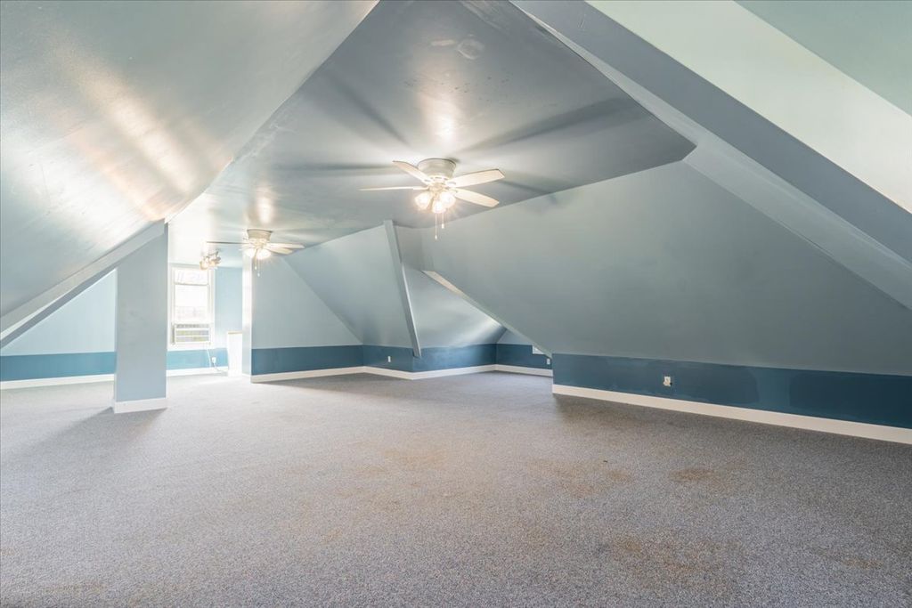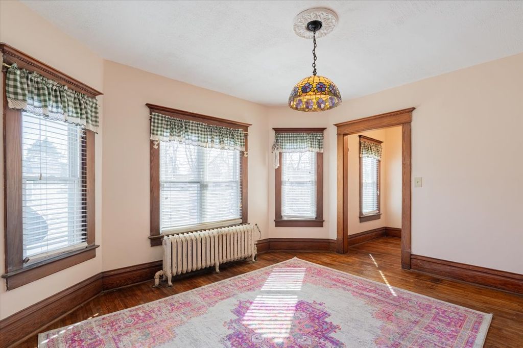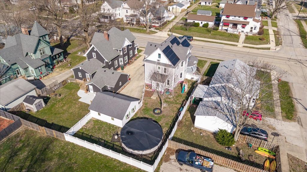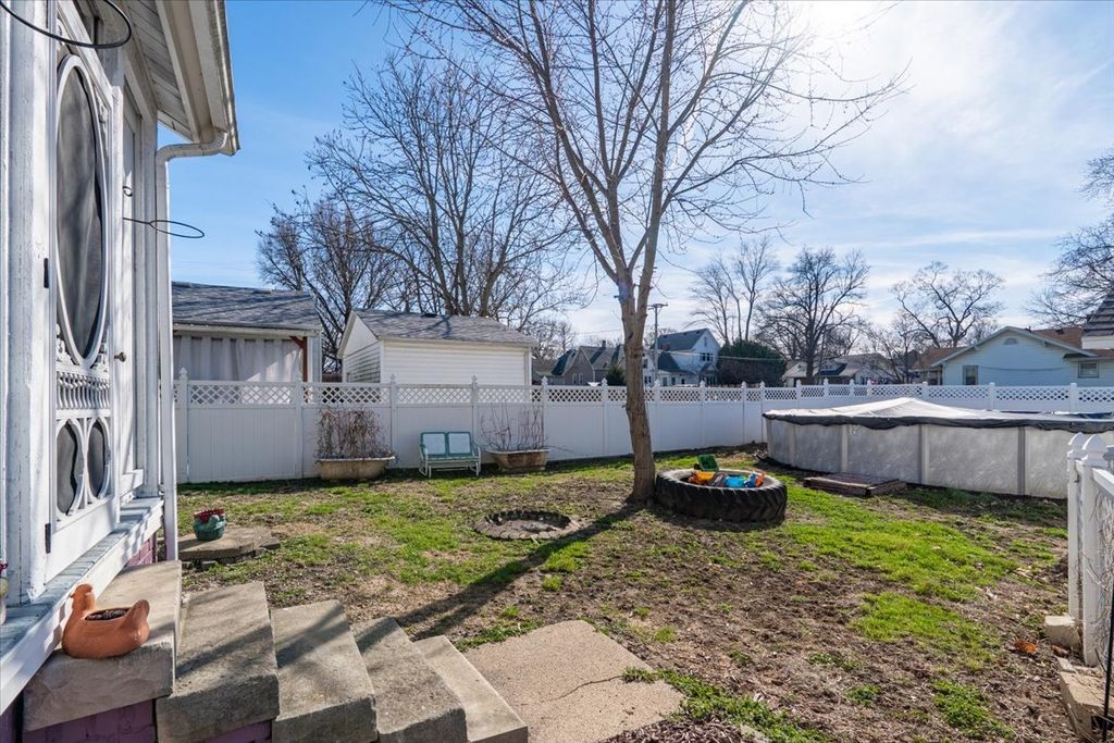 Charming Victorian home full of character and space! This beautiful property features original woodwork, hardwood floors throughout, and stunning stained glass accents. Replacement windows by Pella provide efficiency while maintaining the home's classic appeal. Enjoy outdoor living with a vinyl fenced yard, a 24 ft above ground pool with all equipment included (robot cleaner, mesh cover, and ionizer), and a welcoming wrap around porch. Roof was replaced in 2004 with a 50-year shingle, and solar panels are installed (additional information available). A 2 car detached garage completes the exterior. Step inside to a spacious foyer leading to the living room, which flows into a family room with a decorative fireplace. Continue into the formal dining room and kitchen featuring built-ins and stainless steel appliances, all of which stay. A convenient half bath and laundry chute access add to the main level functionality. Upstairs offers generously sized bedrooms, including one with a versatile bonus room. Two bedrooms feature walk-in closets, and a full bath serves the upper level. Laundry chutes are accessible from both floors. Additional living space awaits in the finished attic (41x32), perfect for a variety of uses. The full unfinished basement provides even more storage. Area rugs can remain. This home offers incredible space, charm, and functionality, don't miss it!