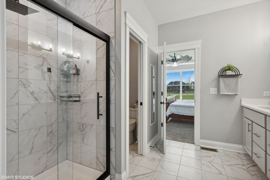 Welcome to luxury living in Plainfield! This stunning Ranch Model, constructed in 2022, boasts over $60K in upgrades, promising the epitome of elegance in a single-level living space . As you step into the foyer, you are greeted by an expansive great room adorned with impressive 13' tray ceilings, complemented by custom light fixtures and ceiling fans, ensuring both style and temperature control. The open-concept layout seamlessly integrates the kitchen, adorned with high-end appliances, quartz countertops, soft-close drawers, crown molding, and a captivating shiplap wall design. Adjacent to the kitchen lies the dining room, offering picturesque views of the brick paver patio, gazebo, and a serene sitting area complete with a firepit-ideal for entertaining or unwinding in style. Retreat to the spacious bedrooms, including the primary bedroom boasting an ensuite bath with a glass enclosure shower, dual vanity, and an expansive walk-in closet outfitted with a custom organization system-perfect for indulging in relaxation and rejuvenation. Descend to the full basement, featuring a deep-pour foundation, offering endless possibilities, with a bathroom rough-in-a blank canvas awaiting your personal touch. Situated on nearly a half-acre of land, this home backs onto an open field, ensuring privacy and tranquility, with no future development impeding the serene ambiance. Nestled in the esteemed Springbank Subdivision, residents have access to a plethora of amenities, including a dazzling 9-acre Aquatic Center featuring a lap pool, water slides, zero-depth pool, sand play area, bocce ball courts, and sand volleyball-enjoy luxury living with resort-style amenities at your doorstep. Conveniently located within the coveted Plainfield School District, this residence offers a harmonious blend of sophistication, comfort, and convenience-don't miss the opportunity to make this exquisite property your forever home. Schedule your showing today!