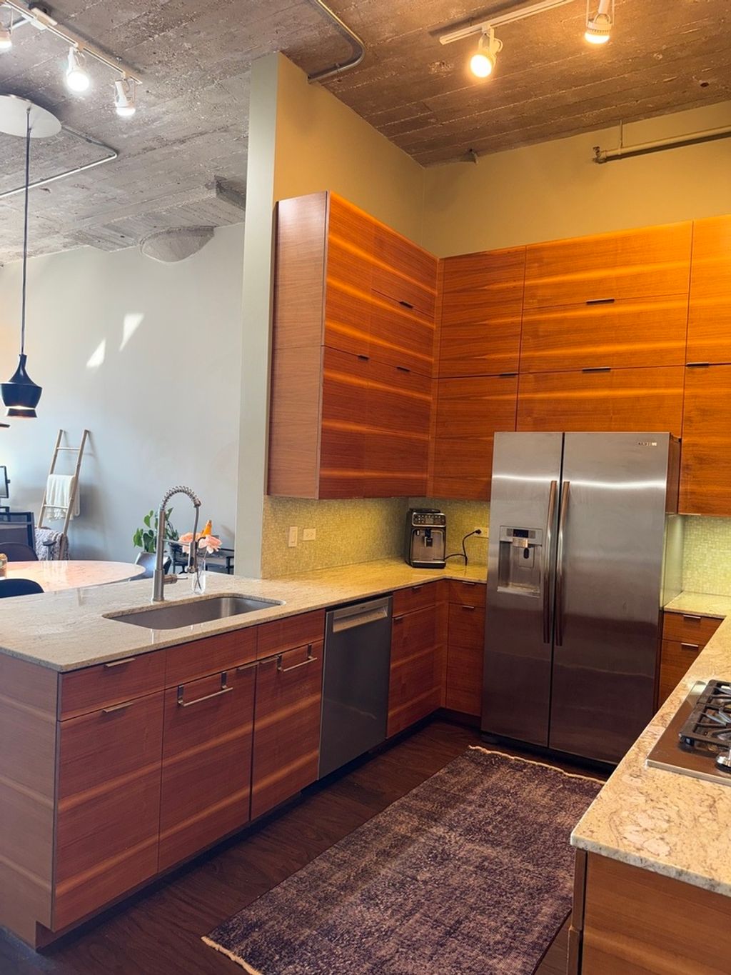 Step into this stunning light-filled 1-bedroom unit at Chess Lofts! South-facing with soaring 12-ft concrete ceilings, exposed brick, huge windows, and dark wide plank floors - this one is not to be missed. Once a 2-bedroom/2-bath, now converted to a 1100 square foot 1-bedroom/2-bath, you will be amazed by how expansive the hosting space is with ample storage throughout- no detail was missed when renovating this unit! Kitchen features custom cabinetry, pull out cabinet drawers, stainless steel appliances (Dishwasher and Microwave updated in 2025), and granite countertops. Entryway includes a completely enclosed custom closet with in-unit W/D. Large dining space with chandeliers throughout. Living space was previously split to include an office. Unique pull-out projector screen from one of the shelves in the living space. Fully-enclosed primary bedroom has blackout shades, beautiful hanging light fixtures, and an ample walk-in closet. Two large full bathrooms with storage. This home is perfect for entertaining with a 100sqft private terrace! The building offers a rooftop deck with incredible city and lake views, a gym, bike storage, package room, and onsite engineer. Parking space additional $30k and includes space for storage bins. HOA assessments include heat, air, cooking gas, water, common area maintenance, scavenger, common area gym, rooftop and package room. Building is PET FRIENDLY and is located next to a dog park, playground, lakefront path, museums, boat harbor, Grant Park, Solider Field, Wintrust Arena and McCormick Place! Ample street parking available, minutes to public transit and dining/entertainment. Investor friendly - no rental cap! Mint condition!
