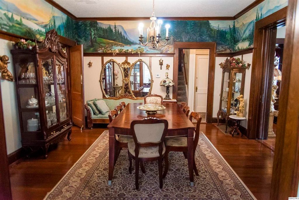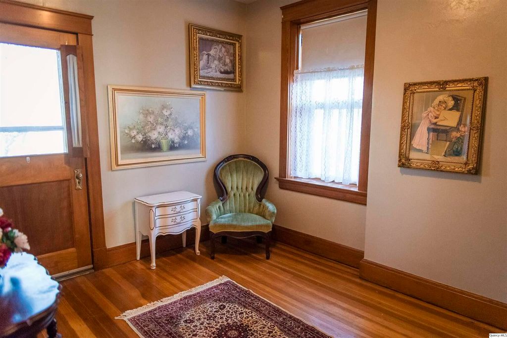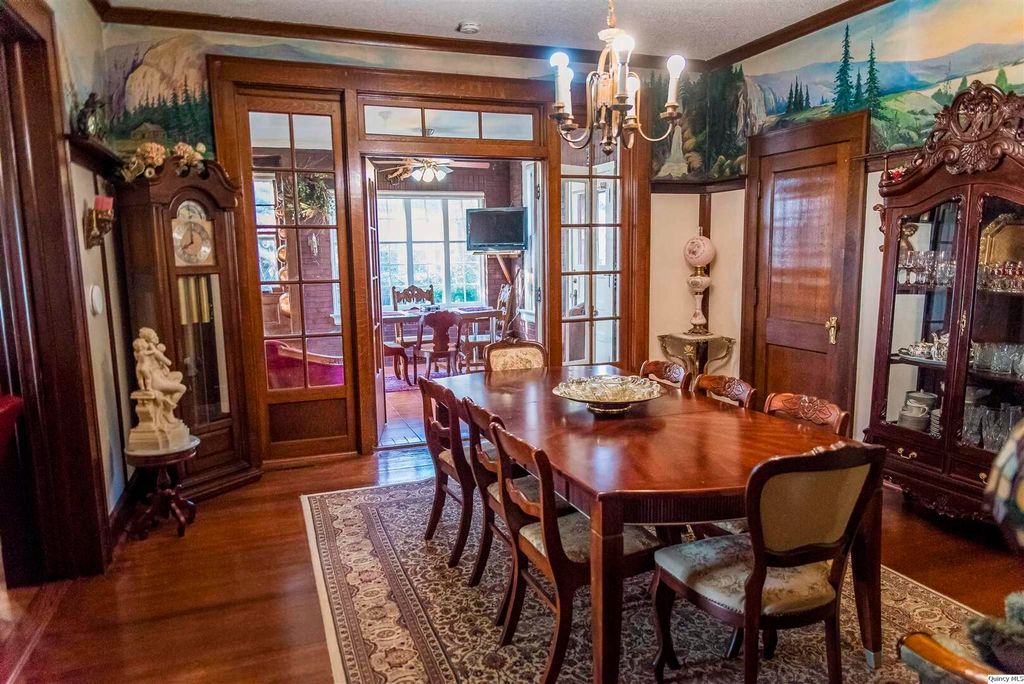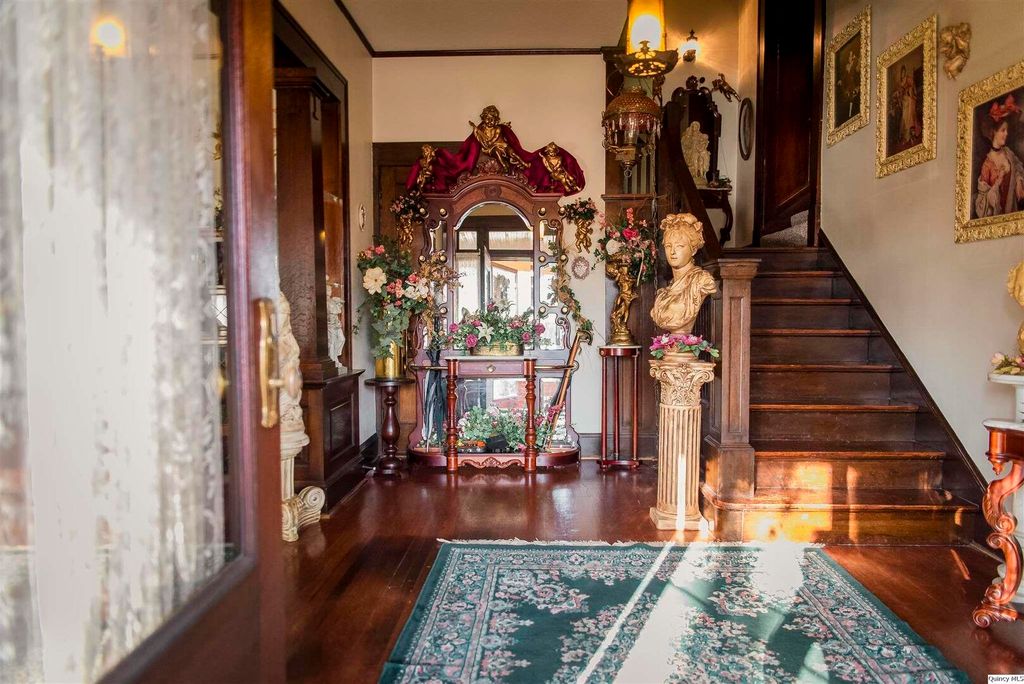 Welcome to 3,333 square feet of impeccably preserved history located in the Quincy East End Historic District. This all-brick, three-story Foursquare seamlessly blends the refined aesthetics of the Arts and Crafts and Prairie styles, from the massive front door and original 1910 foyer chandelier to the pristine original woodwork throughout. The centerpiece is the formal dining room, boasting a 1941 hand-painted mural. While the soul is historic, the systems are new with new electrical panel, wiring and upgrades throughout, professional brick tuckpointing, and new second-floor a/c in 2025. The chef's kitchen is a bright, open sanctuary featuring large windows overlooking the fenced backyard with a spacious patio for entertaining and landscaped with perennial flowers and blooming trees that provide color and privacy nearly all year long. With five bedrooms, 2.5 baths, and an expansive three-story layout, this home offers the space and soul that only a century of history can provide.