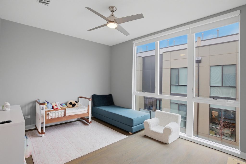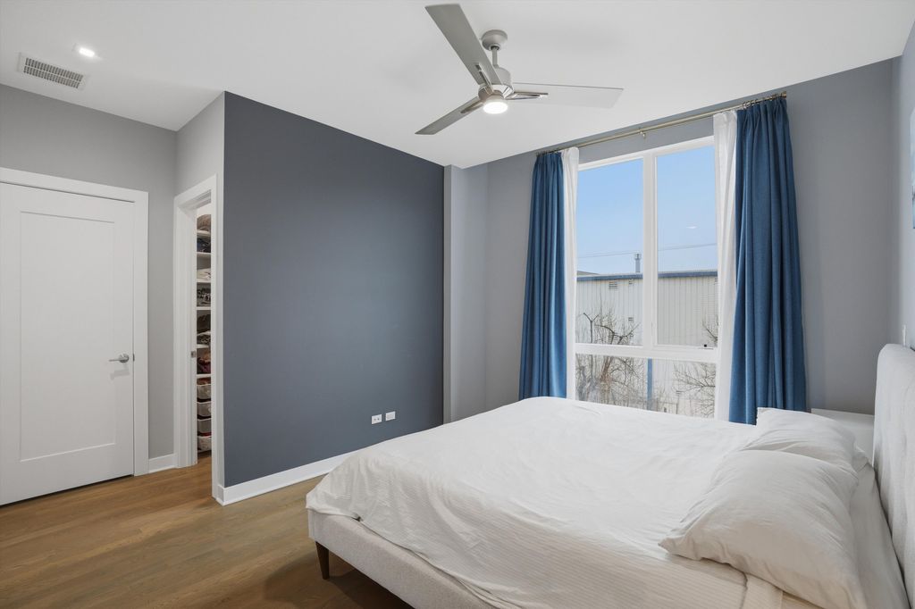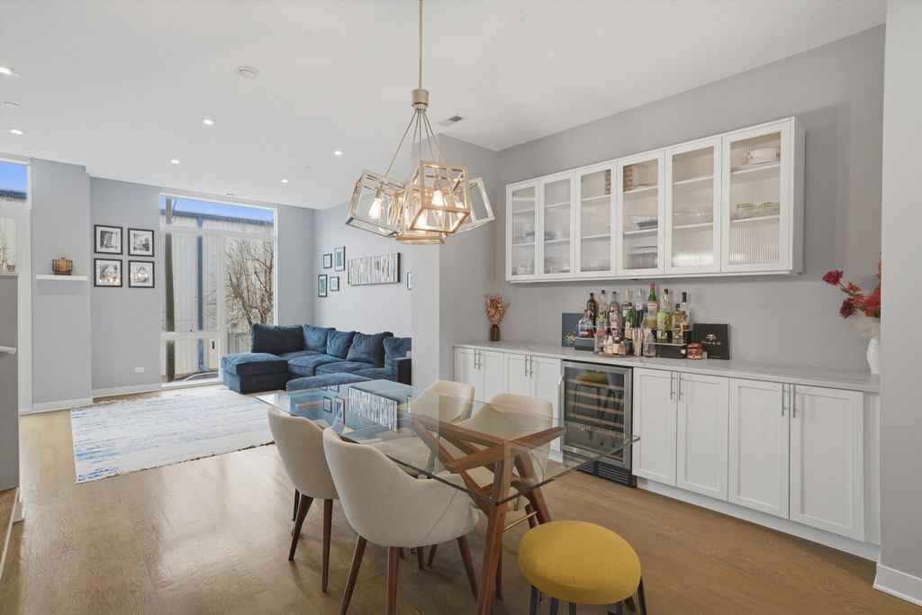 This exceptional extra-wide Bucktown townhome offers 3 bedrooms, 3.1 bathrooms, an attached two-car garage, and a stunning private rooftop deck that stretches the length of the home. Thoughtfully designed with high-end finishes and a functional layout, this residence lives like a single-family home while offering the convenience of modern city living. Enter through a landscaped, fenced front yard into a welcoming foyer featuring a smart lock entry, stylish lighting, and a coat closet. The first level includes a spacious bedroom with tile flooring and a private ensuite bathroom complete with a sleek vanity and glass walk-in shower, ideal for guests, a home office, or additional living space. The main level is bright and open, designed for both everyday living and entertaining. The chef's kitchen showcases Bosch appliances, including a five-burner gas range with vented hood, quartz countertops, double-stacked European cabinetry, a stylish subway tile backsplash, and a large waterfall island with seating, integrated microwave, and abundant storage. Just off the kitchen is a private balcony, perfect for grilling or enjoying your morning coffee. The dining area sits centrally between the kitchen and living space and features a custom built-in bar with wine refrigerator, illuminated cabinetry, and statement lighting. The expansive living room overlooks a charming tree-lined street and is filled with natural light from oversized windows. A powder room completes this level. Upstairs, two generously sized bedrooms include a spacious primary suite with floor-to-ceiling windows, a professionally organized walk-in closet, and a spa-inspired marble bathroom with a double vanity, large walk-in shower, and separate water closet. The second bedroom also features floor-to-ceiling windows and its own ensuite bath with a tub/shower combination. A convenient hallway laundry area includes a full-size LG front-loading washer and dryer. At the top of the home, the fully built-out private rooftop deck provides the perfect outdoor retreat. Designed with durable decking and turf, the space easily accommodates lounge seating, outdoor dining, and entertaining while offering sweeping neighborhood views. Additional features include oak flooring on the main and upper levels, custom window treatments, dual-zone HVAC with Nest thermostats, and an ADT security system. Ideally located in the heart of Bucktown near Logan Square, this home is just moments from the CTA Blue Line, the 606 Trail, and the vibrant dining, shopping, and nightlife along Armitage and Milwaukee Avenues. Explore the property in 3D by clicking the virtual tour to walk through every detail of this exceptional home.