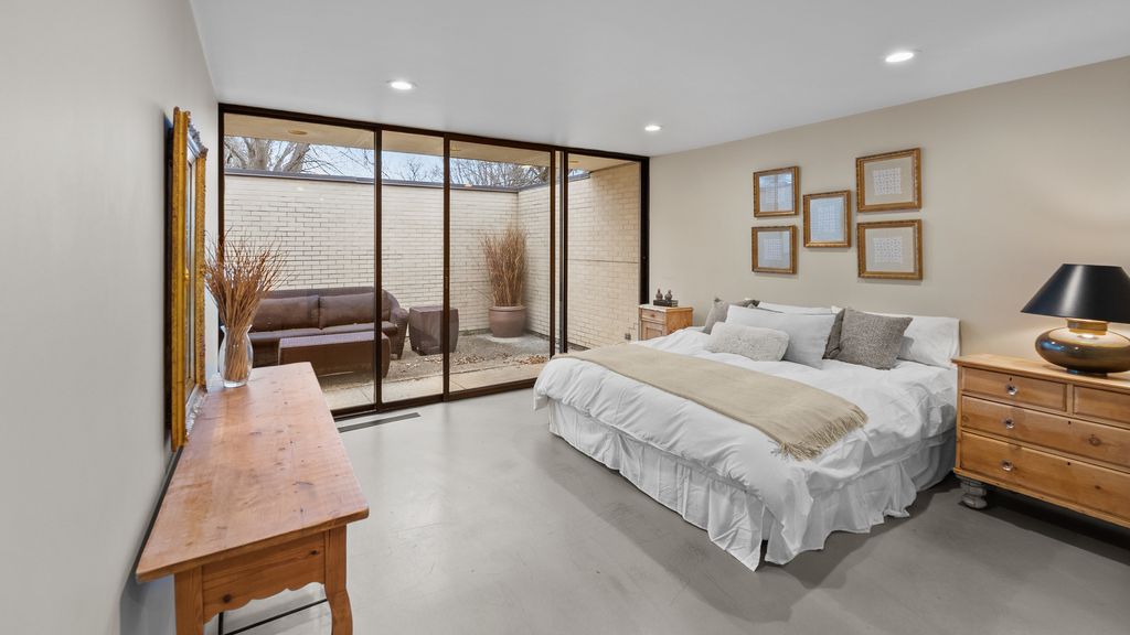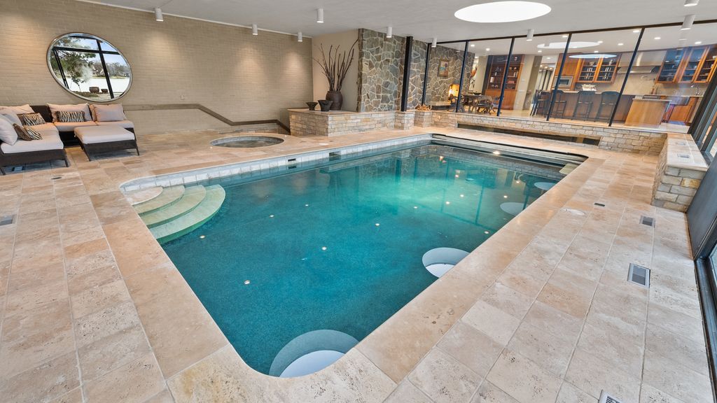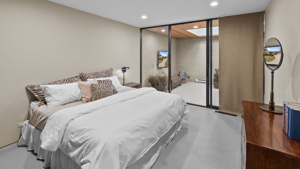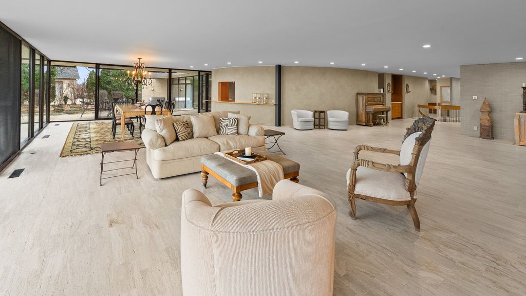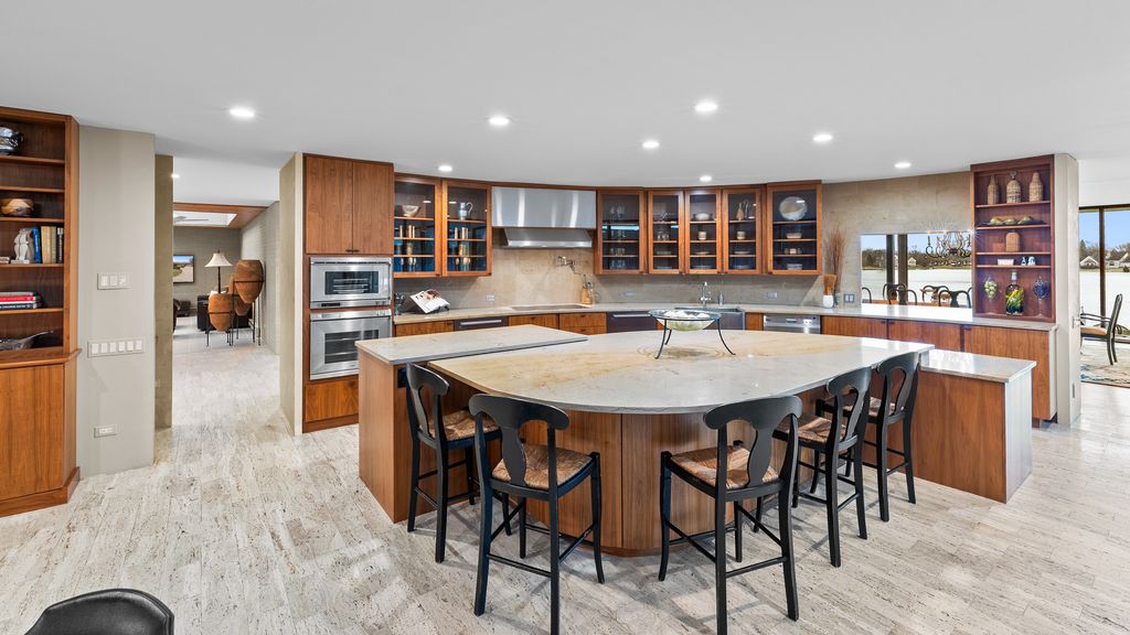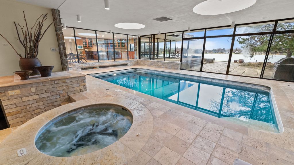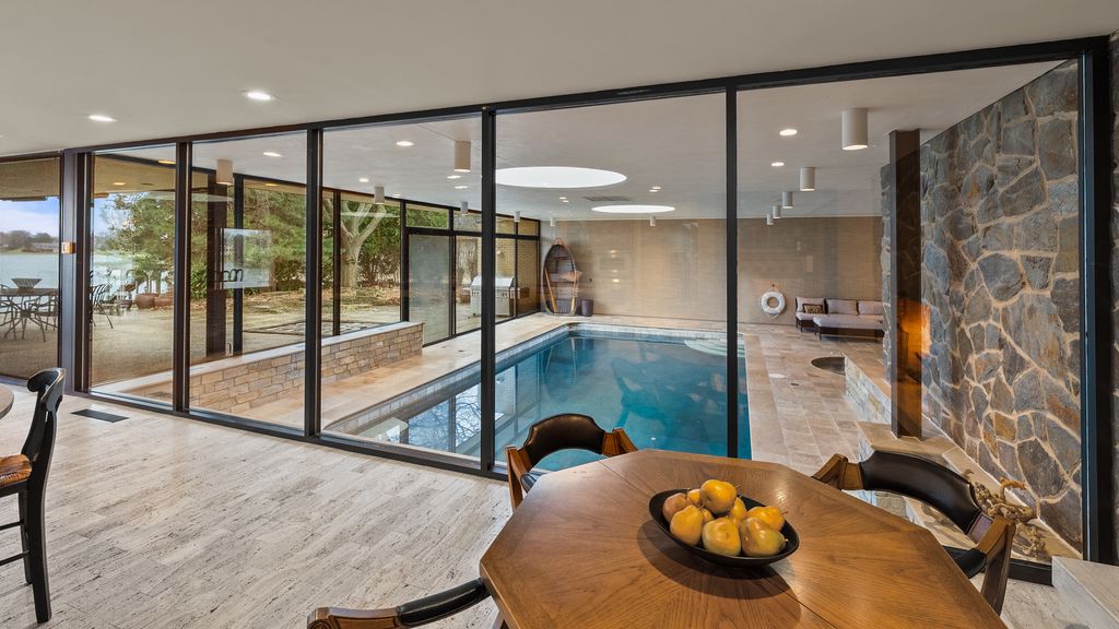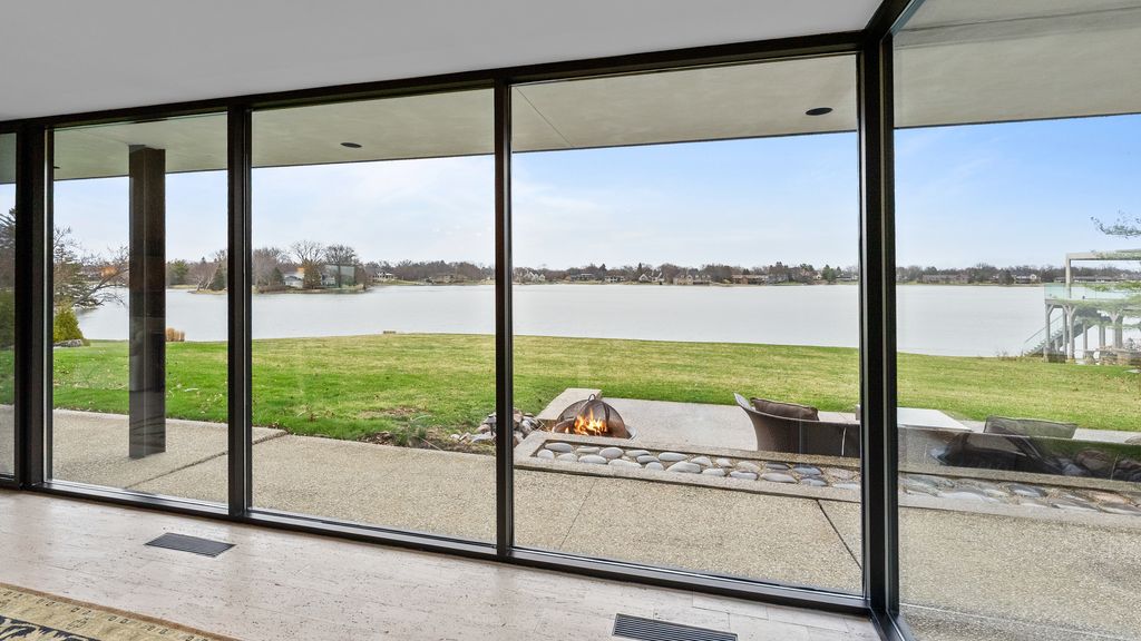Designed by architect Peter Roesch, a direct student of Ludwig Mies van der Rohe, this exceptional residence embodies the timeless principles of true modernist design. With clean lines, expansive walls of glass, and a seamless connection between indoor and outdoor spaces, the home is not only an architectural gem but also offers a rare opportunity to experience waterfront living on the stunning 85-acre Lake of the Coves. Expansive floor-to-ceiling windows frame breathtaking lake views and flood the home with natural light, creating a serene, ever-changing backdrop. Exceptional craftsmanship and curated designer finishes shine throughout, including timeless travertine floors, impressive 8-foot doors, and custom European walnut cabinetry accented with distinctive leather cabinet pulls. At the center of the home, a dramatic 22' x 17' sunken conversation pit with a fireplace crowned by a sculptural copper hood serves as a sophisticated focal point. A curved architectural wall finished in Venetian plaster elegantly separates the living room from the kitchen, adding a dramatic custom design element. The finished basement features a spacious family room, a 380-bottle wine wall, oversized storage, and a dedicated dog-wash room. The private sauna and changing rooms lead you to the extraordinary 38' x 35' indoor area that creates a true year-round retreat, featuring an inground pool and whirlpool spa. More floor-to-ceiling windows with breathtaking views of the lake bring the beauty of the waterfront indoors. Embrace the ultimate lake lifestyle with your own private boat dock equipped with electric power-perfect for effortless days on the water, sunset cruises, and lakeside entertaining. Whether it's morning coffee by the water, afternoons spent boating, or evenings enjoying peaceful panoramic views, this home offers a lifestyle that feels like a year-round vacation. This home is truly a must-see for buyers seeking something special.