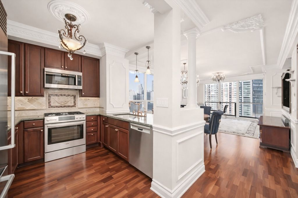 Sophisticated CORNER residence providing north and west exposure with iconic Chicago views! Impeccably designed and exquisitely appointed, this split floor plan 2Bed/2.5Bath corner residence offers sweeping, unobstructed views of the Chicago River, skyline, Navy Pier, and Lake Michigan. Every element of this home reflects refined craftsmanship and timeless elegance, from the hardwood floors and intricate crown molding to the paneled wall details, marble baths, and custom closets with integrated storage. The chef's kitchen is a statement of style and function, featuring marble finishes, Sub-Zero and Bosch appliances, and custom cabinetry. A private balcony spans the full width of the home, providing a breathtaking vantage point of the city and river. Residents enjoy an unparalleled lifestyle with resort style amenities; including an indoor pool and hot tub, state of the art fitness center, sundeck with built-in grills and gardens, theater, party room, library, game room, children's room and resident lounge. 24 hour door staff, on-site management & engineers. Additional storage and garage parking included!