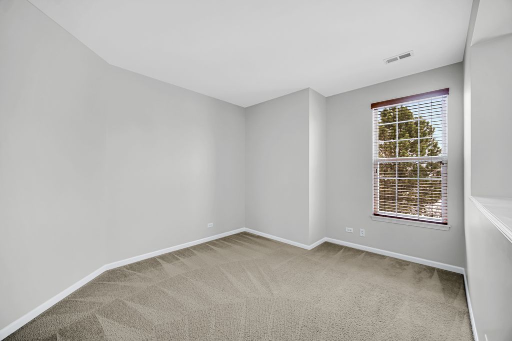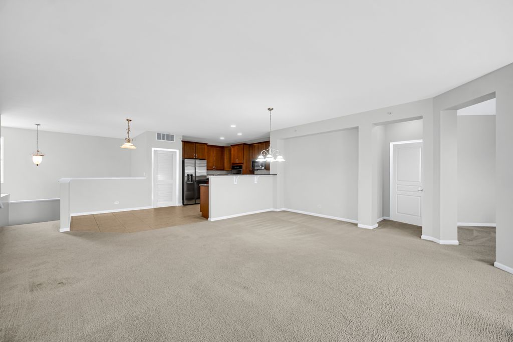 Upper-level unit located in the highly desirable Lions Gate community. This rarely available, largest model offers 3 bedrooms plus a den and 2 full bathrooms. The home features brand-new paint throughout, including ceilings. The spacious great room showcases vaulted ceilings and a sliding glass door that opens to a private balcony. The open-concept kitchen includes stainless steel appliances, oak wood cabinetry, a pantry, and a breakfast area. Recent upgrades include a newer hot water tank and dishwasher. The primary suite features a custom walk-in closet and an en-suite bath with double sinks, a soaking tub, and a separate walk-in shower. Additional highlights include a skylight in the second bathroom, a Jacuzzi tub in the primary bath, and oak trim and doors throughout the home. An oversized two-car garage provides ample storage. Ideally located just minutes from Woodfield Mall, golf courses, and major expressways including I-90, I-290, and I-355. Situated within the highly rated schools of Michael Collins Elementary, Margaret Mead Junior High, and Conant High School. Investor-friendly.