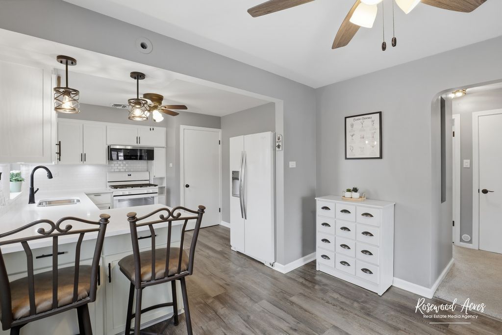 Welcome to this beautiful & inviting home in the heart of Summit, perfectly positioned on a desirable lot with off street parking, private drive and all designed for flexible living! Inside, you'll find a warm and inviting layout with thoughtful updates throughout. The light and bright living room with updated carpet and paint leads to a refreshed kitchen that features elegant quartz countertops, large pantry, breakfast bar with stools, updated light fixtures that add a modern touch throughout the home and flows seamlessly into the dining room, large pantry, updated family bath with floating vanity is shared with two oversized bedrooms... A standout feature is the lower level living area that could be related living space with its own private entrance, large eat in kitchen with 2nd pantry, heated floors throughout so no need to worry about chilly feet, spacious living area with brick fireplace, a bedroom with cedar lined walk-in closet, 2nd laundry area and updated bath with walk in shower, ideal for extended family, guests, or multi-generational living. Step outside to enjoy a fully fenced yard complete with 3 season room that creates the perfect space for summer gatherings and outdoor relaxation. The gas-start fireplace creates a cozy focal point for everyday living and entertaining. Lines run for underfloor heating in 3 season room, just finish connection. 2 car brick garage has chimney if you want to add heat. Recent improvements include bathrooms, flooring, kitchen quartz counter tops, paint, lower-level window, moveable lower-level wall for ease of moving large furniture, all appliances stay... just minutes from highways, shopping, parks, and everything the community has to offer, making daily life both convenient and connected. Don't miss out- schedule your showing today!! Please Remove Shows for showings, there are cameras and electronic devices in and around the home. Thank you