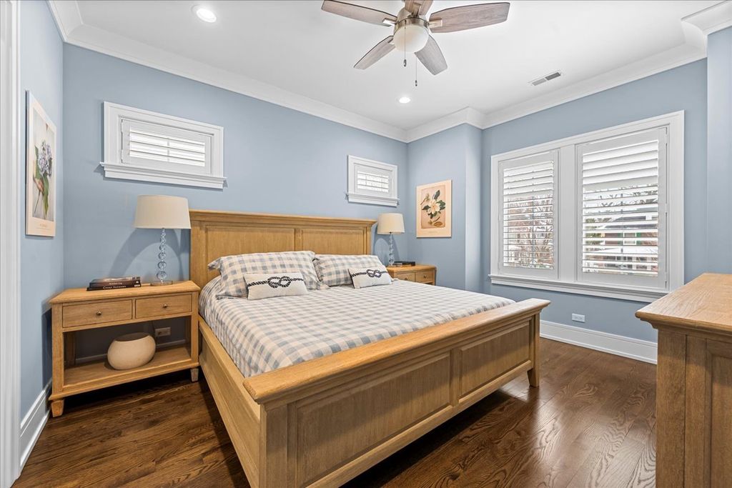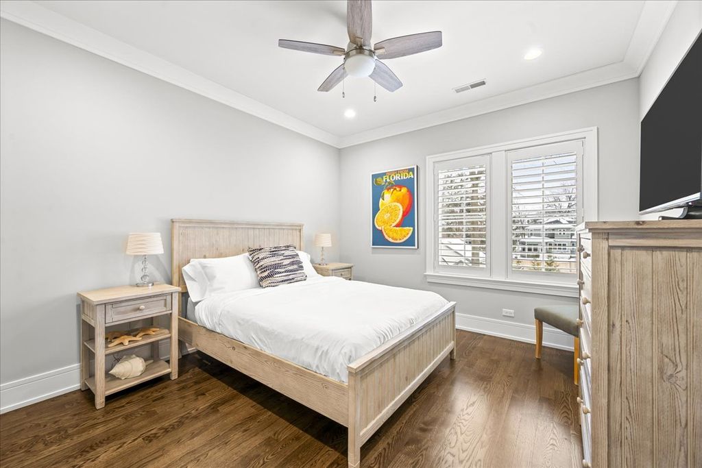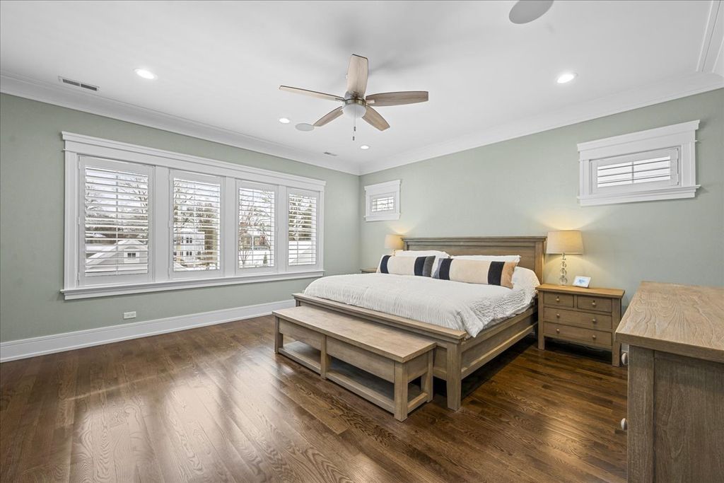 A truly exceptional 2019 construction in the heart of East Wilmette! This stunning home is rich with refined craftsmanship and thoughtful design at every turn. Each room showcases exquisite details including wainscoting and double crown moldings, stunning hardwood floors and plantation shutters throughout. Ten-foot ceilings elevate the first floor, beginning with a grand foyer that opens to an elegant living room and a private office featuring custom cabinetry and full data/wifi wiring. The dining room impresses with a striking coffered ceiling and flows seamlessly into an incredible butler's pantry complete with abundant custom cabinetry (upper glass fronts), dual quartz countertops, a beverage refrigerator, and sink, plus an additional walk-in pantry for effortless entertaining. Open to the kitchen, the family room is both warm and sophisticated, centered around a gas fireplace framed by custom built-ins. French doors lead to a raised stone terrace, with privacy fence, perfect for indoor-outdoor living. And the kitchen? Simply spectacular. Designed for both beauty and function, it features a show-stopping quartz island seating six, two dishwashers, a farmhouse stainless steel sink, a 60" Sub-Zero refrigerator, and a 48" Wolf six-burner double oven range. A sun-filled breakfast room and an impeccably organized mudroom complete the first floor. Upstairs, gracious 9' ceilings enhance the serene second floor. The luxurious primary suite offers a spacious walk-in closet and a spa-inspired bath with radiant heated floors, steam shower, and private water closet. Three additional bedrooms are bright, roomy and all ensuite. The third floor features a bedroom, bonus room, and full bath, accented by charming window seats. Would make a fabulous second office, hang out room or craft center! The lower level expands the living space with a massive recreation room, two additional bedrooms, a designer full bath, exercise room, and a wet bar, plenty of space to host guests! The yard is large and professionally landscaped. All of this just steps from downtown Wilmette, schools, Metra, and the lake.