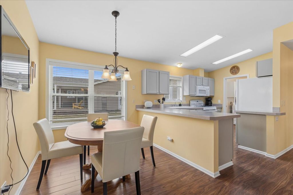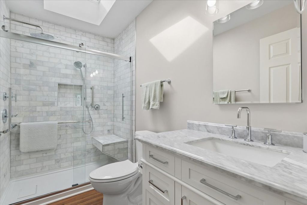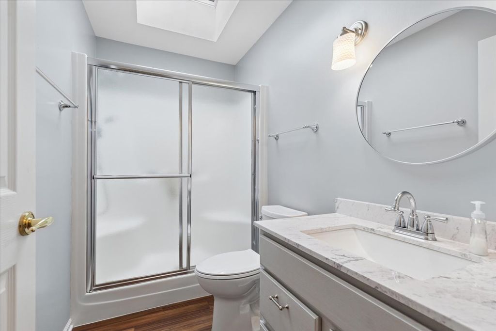 Incredible updates: the primary bath with a new walk-in shower featuring a built-in bench seat and updated quartz vanity is one of the many updates to this Castleton-model home. Hall bathroom with quartz vanity and updated shower. The primary bedroom offers a walk-in closet and bay window for plenty of natural lighting. New hot water heater, new dryer, new sump pump, plus a new NEXT thermostat added for your comfort. Roof 2018, skylights and sliding door added 2023. Anderson Front Door. Wood laminate flooring. Cathedral ceiling: accents the living/kitchen space. Recently added new cabinets in the laundry room. The yard is perfect for morning coffee or evening cocktails and offers a view of the lake and green belt area. Fantastic 55+ community with lakes offering catch-and-release fishing, a private clubhouse, an exercise facility, a community garden, pickleball and bocce courts, and walking paths. Plenty of group activities to enjoy and meet your neighbors. Selling as-is!