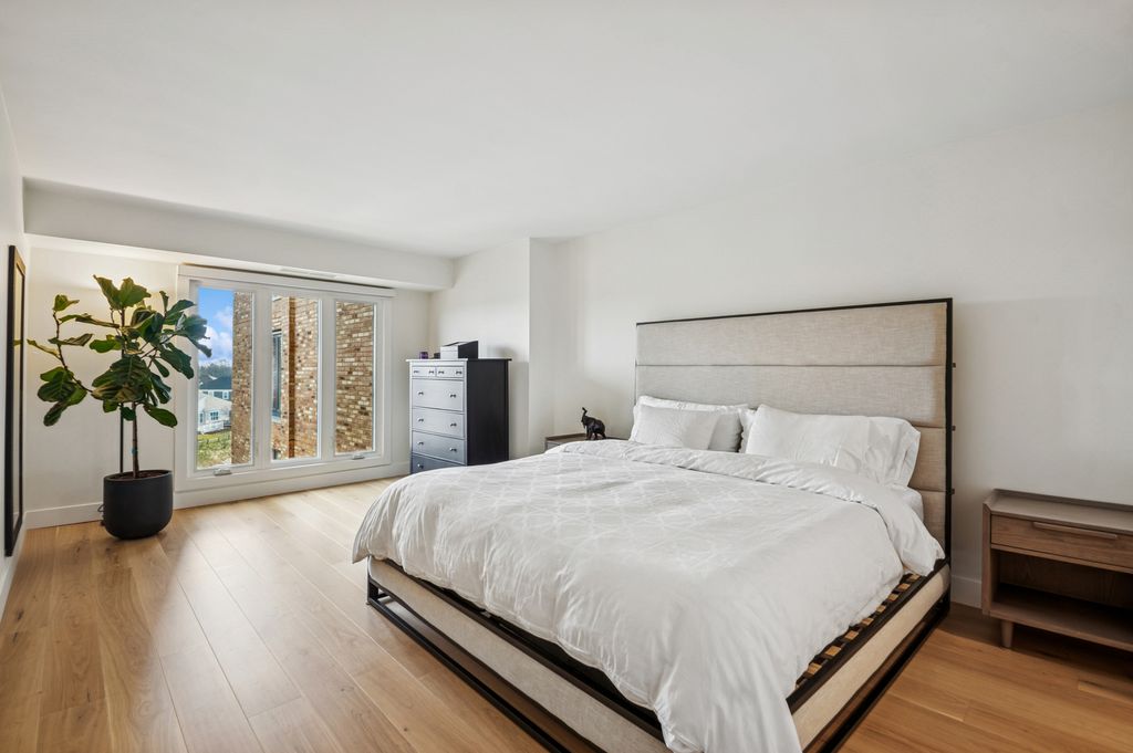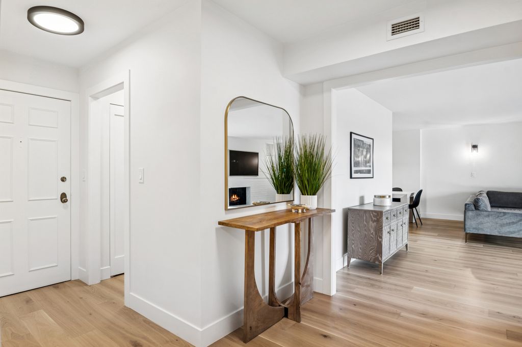 Perfect, newly-remodeled fourth-floor unit with southeast pond views in the premiere Mission Hills community! Rarely available move-in ready retreat on a high floor and with the best views. This is an expansive 2 bedroom, 2 bathroom condo where everything has been upgraded to a high level and with exceptional attention to detail- new 7" wide plank white oak flooring, stunning chef's kitchen featuring Quartz counters and lots of custom cabinet space, modern designer bathrooms with spa-like finishes, a primary en-suite wing with large custom walk-in closets, wide relaxing balcony with views, and an in-unit laundry. This is a true oasis with a corner brick-clad gas fireplace, and views from the living room and bedrooms of the serene pond and sunrise. Convenient heated garage parking space, elevator access, and a storage room. Enjoy all that Mission Hills has to offer- 24-hour gated security, outdoor pools, tennis courts, walking paths, and more.