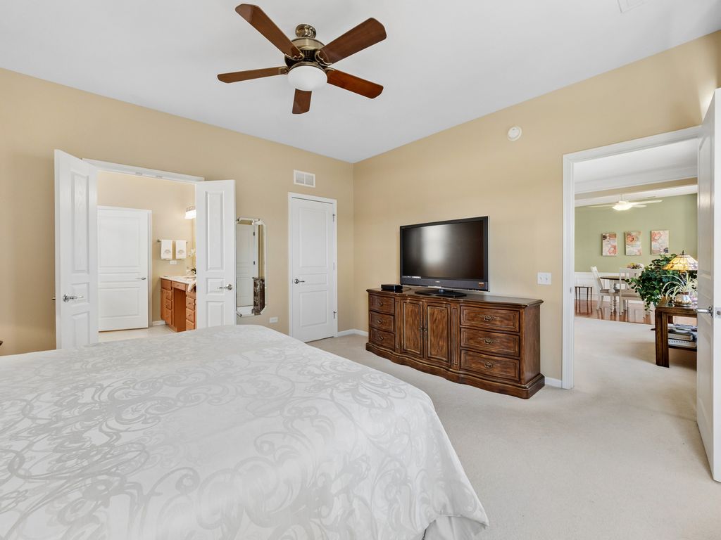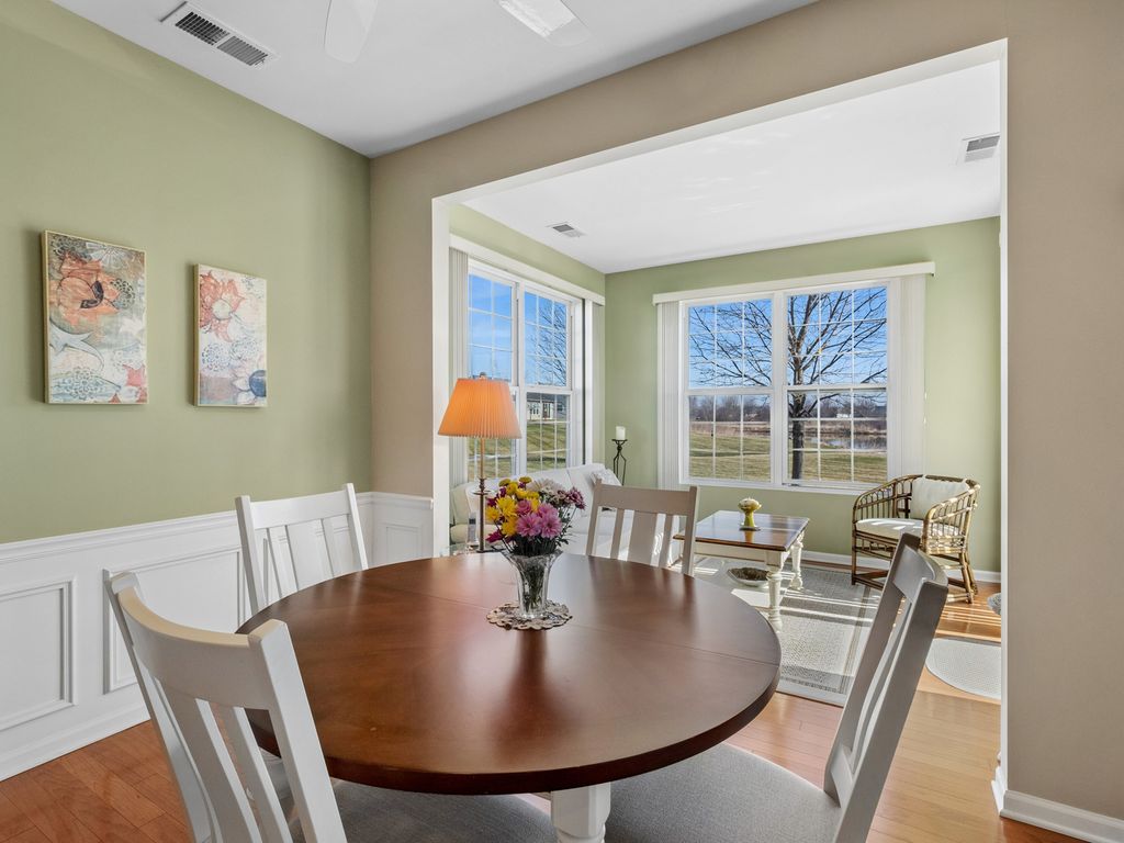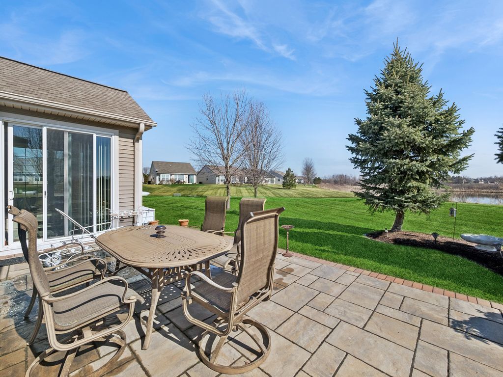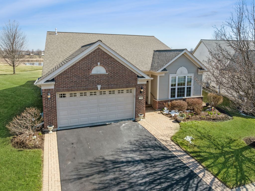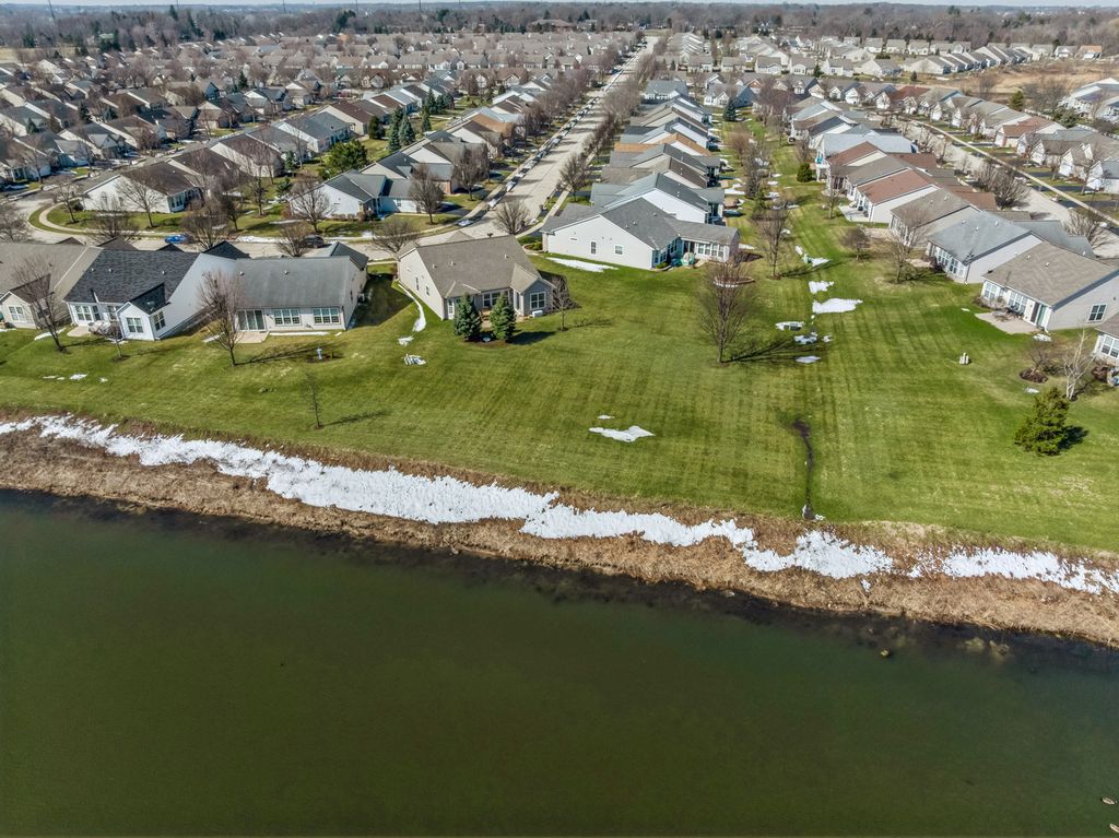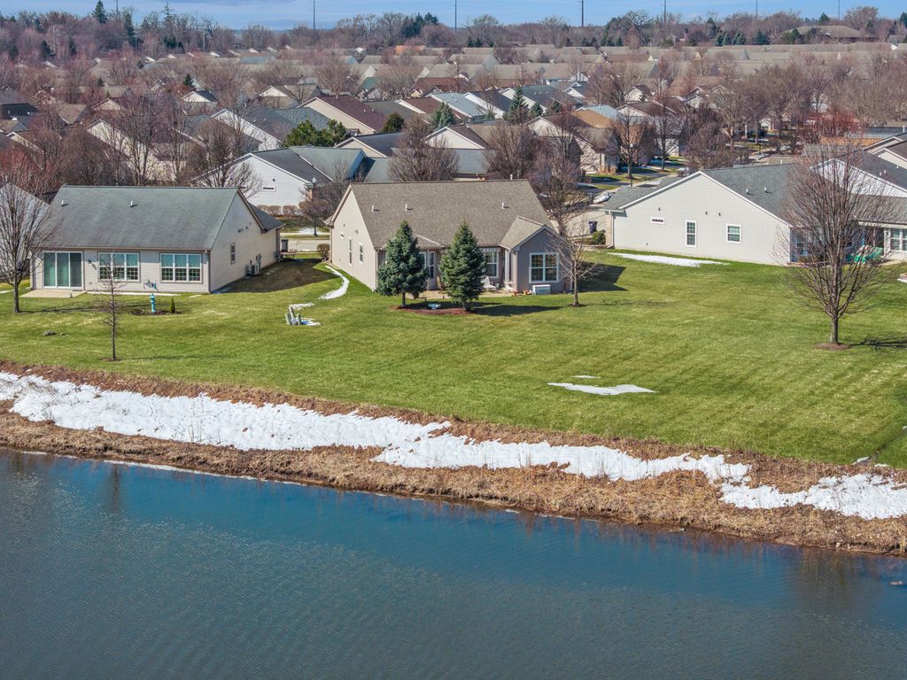 Edgewater by Del Webb "Wilmette" model ranch (1933 sq.ft) with WATER VIEWS AND NO HOMES BEHIND! 2 Bedroom 2 bath 2 Garage with EXTENDED GARAGE & SUNROOM! This home is Immaculate and so well taken care of! Kitchen,sunroom, dining room, and den have hardwood floors, hard surface counters and backsplash.Crown molding in living/dining room. Newer roof, driveway, HWH, furnace, ca, patio, washer, stove, disposal. House located on quiet circle with lot size of 110x136x123x119 overlooking water (Edgewater easement between end of property and water).Edgewater by Del Webb takes care of the snow and grass, 24/7 guard and gated community, large Creekside Lodge with indoor and outdoor pool, hot tub, fitness center, billiard room, tennis/pickle ball courts, bocce courts, and many planned activities. This is a LIFESTYLE!