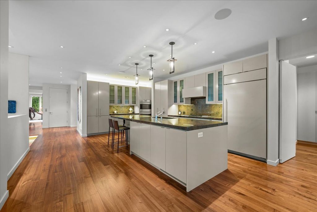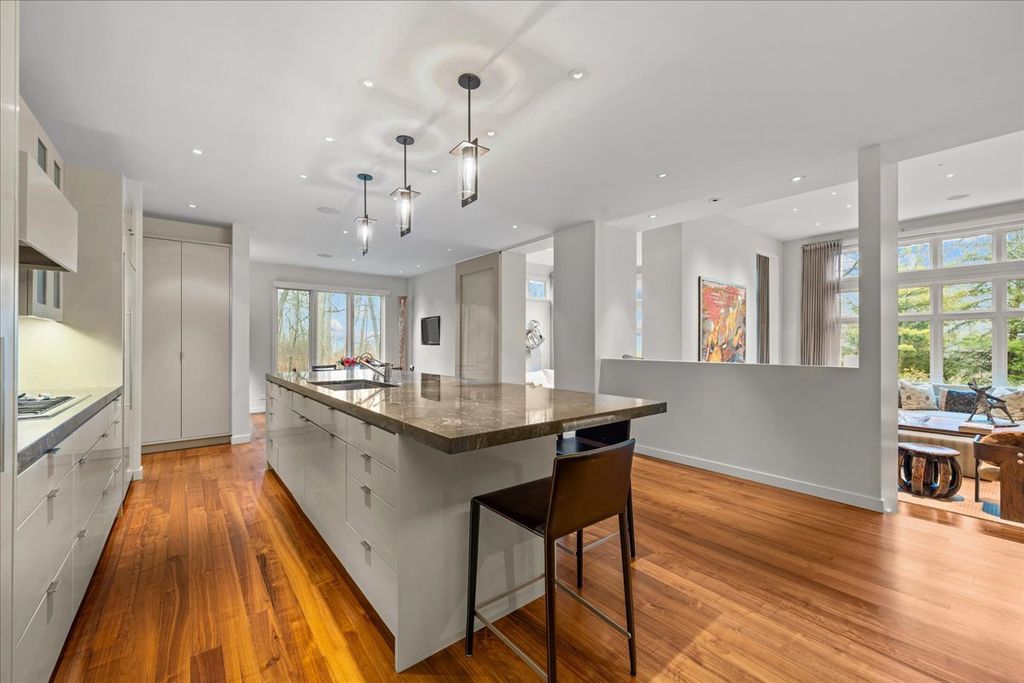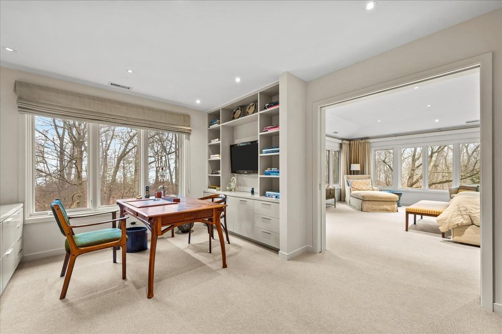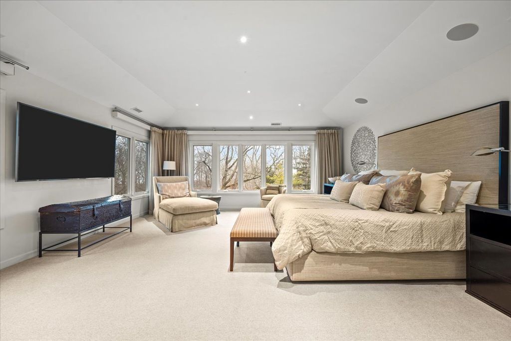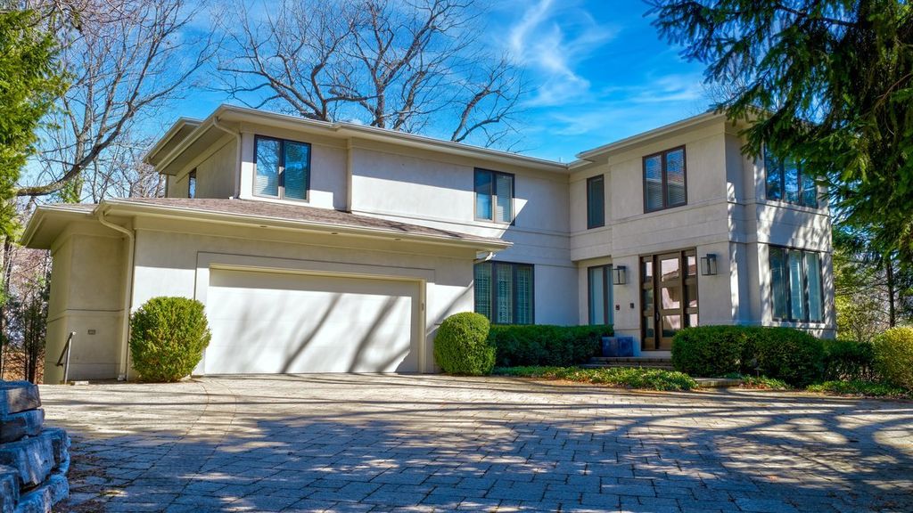 This sophisticated contemporary home, located on a private street with stunning wooded views and seasonal lake views, offers the ultimate in understated luxury. Featuring 5 bedrooms, 5 full baths and 3 half baths, this home is appointed with high-end finishes throughout and an open floor plan ideal for entertaining. Designed by art enthusiasts and completely rehabbed down to the studs in 2010, the home showcases thoughtful design elements including an elevator, hardwood floors, custom millwork, soaring ceilings and expansive windows. The first level welcomes you with a large sun-filled foyer that opens to the formal dining room. A dramatic sunken living room with volume ceilings and a wall of windows creates a tranquil and inviting setting. The expansive chef's kitchen features integrated custom-painted wood slab cabinetry, soapstone countertops and backsplash, professional stainless-steel appliances, a spacious island and an eat-in area. The kitchen flows seamlessly into the family room with custom floor-to-ceiling built-ins and sliding doors that open to an Ipe wood deck overlooking the wooded setting and seasonal lake views. A separate caterer's kitchen leads to the mudroom with a half bath, access to a side grilling porch and entry to the heated and air-conditioned three-car garage. A formal powder room for guests completes the main level. The second level features a tranquil primary suite with a sitting room and built-ins, a large bedroom with tray ceiling and custom walk-in closets. Two luxurious primary bathrooms include custom slab cabinetry, heated natural stone floors, natural stone counters, an oversized soaking tub and spacious showers. Three additional bedrooms complete this level - one with an en-suite bath and two that share a Jack-and-Jill bath - along with a convenient second-floor laundry room. The lower level includes a home gym with steam shower, half bath, second laundry room and ample storage. A private guest suite offers a fifth bedroom, kitchenette, full bath and walk-in closet. Lush professionally landscaped front and side yards surround this meticulously maintained contemporary masterpiece, ideally located in prime east Highland Park within walking distance to town and the lake.