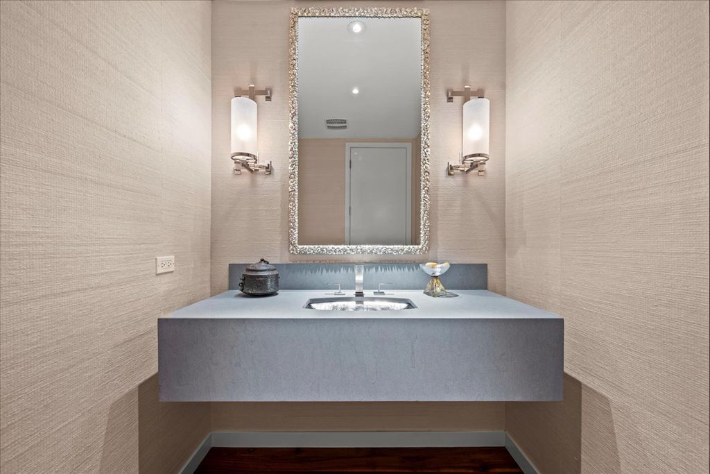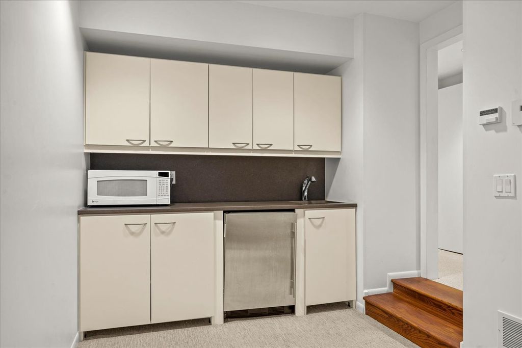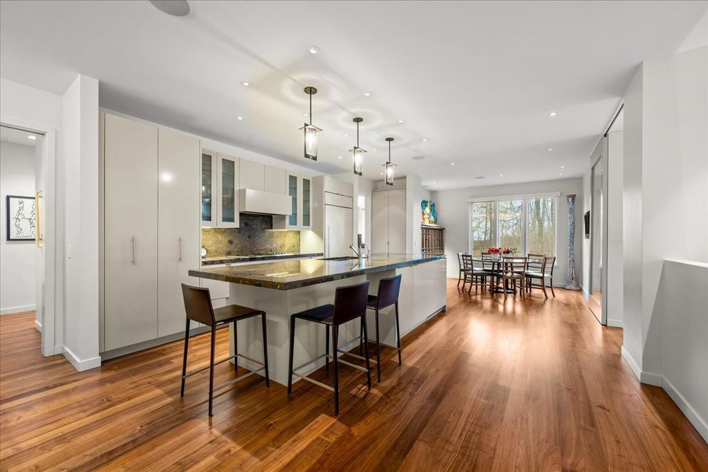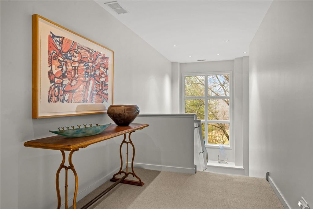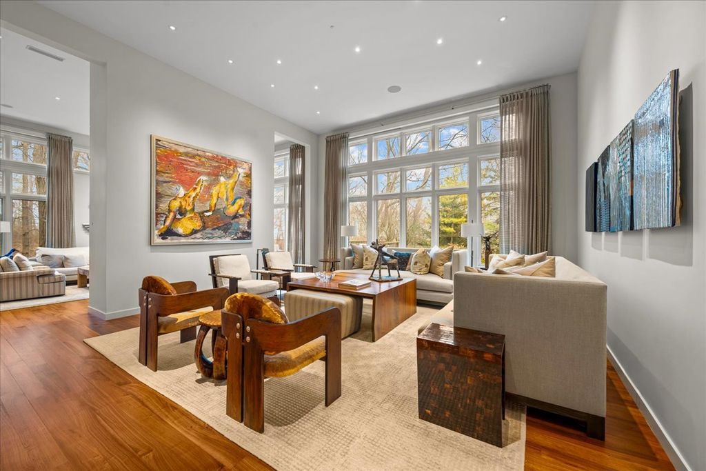 This sophisticated contemporary home, located on a private street with stunning wooded views and seasonal lake views, offers the ultimate in understated luxury. Featuring 5 bedrooms, 5 full baths and 3 half baths, this home is appointed with high-end finishes throughout and an open floor plan ideal for entertaining. Designed by art enthusiasts and completely rehabbed down to the studs in 2010, the home showcases thoughtful design elements including an elevator, hardwood floors, custom millwork, soaring ceilings and expansive windows. The first level welcomes you with a large sun-filled foyer that opens to the formal dining room. A dramatic sunken living room with volume ceilings and a wall of windows creates a tranquil and inviting setting. The expansive chef's kitchen features integrated custom-painted wood slab cabinetry, soapstone countertops and backsplash, professional stainless-steel appliances, a spacious island and an eat-in area. The kitchen flows seamlessly into the family room with custom floor-to-ceiling built-ins and sliding doors that open to an Ipe wood deck overlooking the wooded setting and seasonal lake views. A separate caterer's kitchen leads to the mudroom with a half bath, access to a side grilling porch and entry to the heated and air-conditioned three-car garage. A formal powder room for guests completes the main level. The second level features a tranquil primary suite with a sitting room and built-ins, a large bedroom with tray ceiling and custom walk-in closets. Two luxurious primary bathrooms include custom slab cabinetry, heated natural stone floors, natural stone counters, an oversized soaking tub and spacious showers. Three additional bedrooms complete this level - one with an en-suite bath and two that share a Jack-and-Jill bath - along with a convenient second-floor laundry room. The lower level includes a home gym with steam shower, half bath, second laundry room and ample storage. A private guest suite offers a fifth bedroom, kitchenette, full bath and walk-in closet. Lush professionally landscaped front and side yards surround this meticulously maintained contemporary masterpiece, ideally located in prime east Highland Park within walking distance to town and the lake.