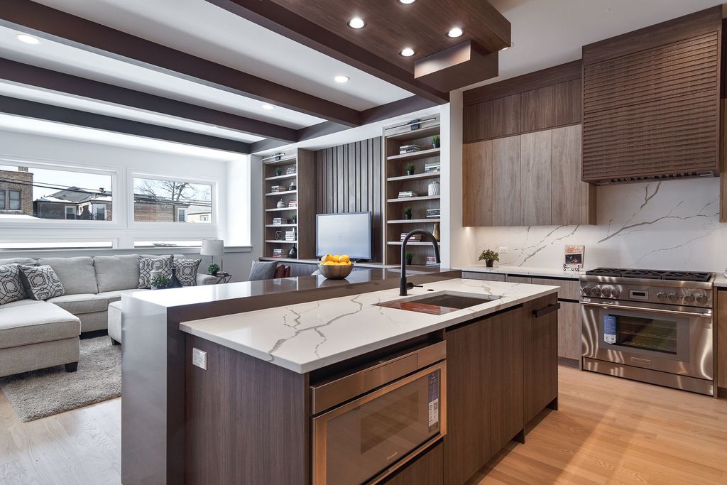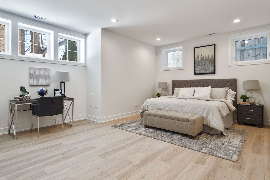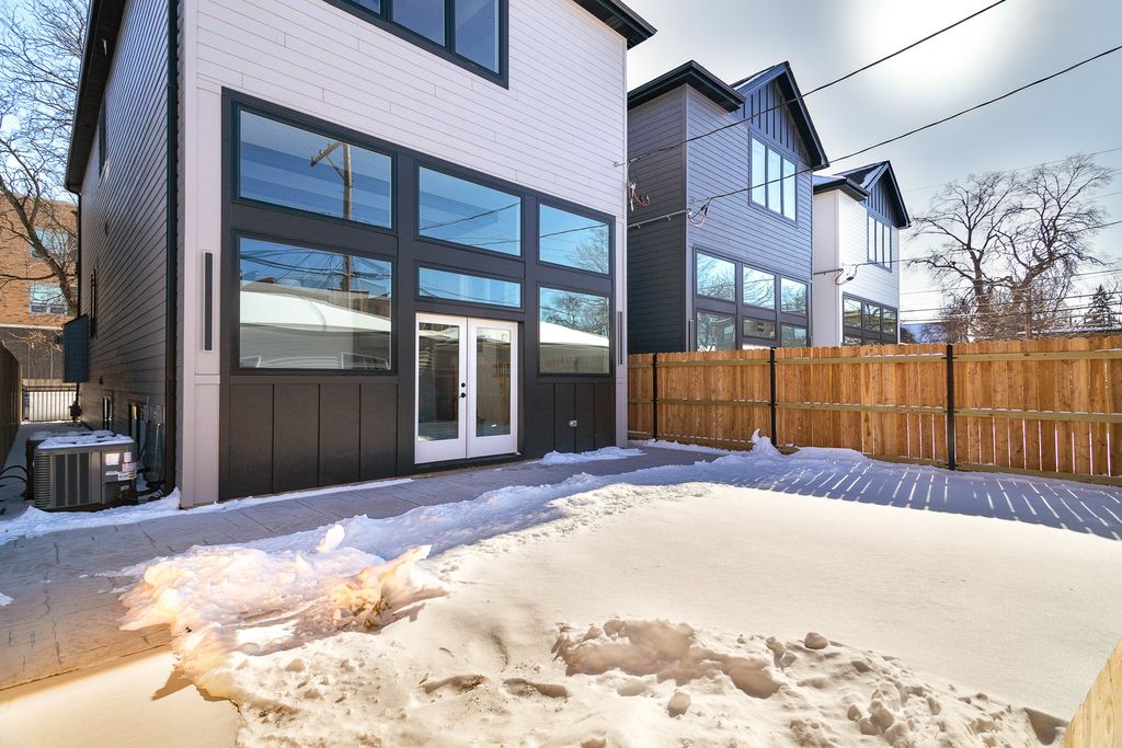 Impeccable new construction single-family home by expert builder on a 30' lot. Great curb appeal with wood grain board and batten facade highlighted by stone, Hardie board siding, black windows, and a modern front entry door. Spacious floor plan with 5 bedrooms and 3.1 baths. Combined living/dining room features large windows offering ample natural light and gas fireplace with floor to ceiling surround. Beautiful oak hardwood flooring throughout main and upper level. Chef quality kitchen perfect for entertaining equipped with professional Thermador appliances, island with bar seating, custom cabinetry, quartz counters, large pantry, and breakfast area. Adjoining family room with custom media center, coffered ceiling, and large windows overlooking the backyard. Rear mudroom with built-in bench. Spacious primary bedroom includes two walk-in closets with custom organizers, and spa like ensuite bath with freestanding soaking tub, frameless glass shower, dual vanities, toilet room, and heated flooring. Three additional bedrooms, guest bath with tub, dual sinks, and heated flooring, and laundry room with sink complete the upper level. Finished basement with radiant heated flooring throughout includes recreation room with wet bar featuring beverage center, 5th bedroom, full bath, second laundry hook-up, storage space, and mechanicals. Every detail has been considered; high end fixtures and finishes, statement lighting, 8' doors, custom ceiling details, pre-wiring for speakers and security cameras, built-out closets and pantry, skylights, and much more. Fully enclosed yard with security intercom + rear stamped concrete patio and detached extra-wide 25' two-car garage. Located in beautiful Peterson Park close to outdoor recreation, shopping, restaurants, and conveniences + other great neighborhoods like Andersonville and Lincoln Square! Photos are from the model home next door.