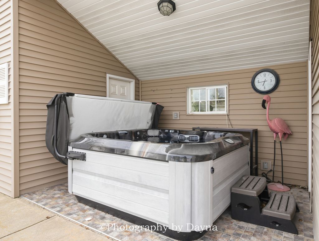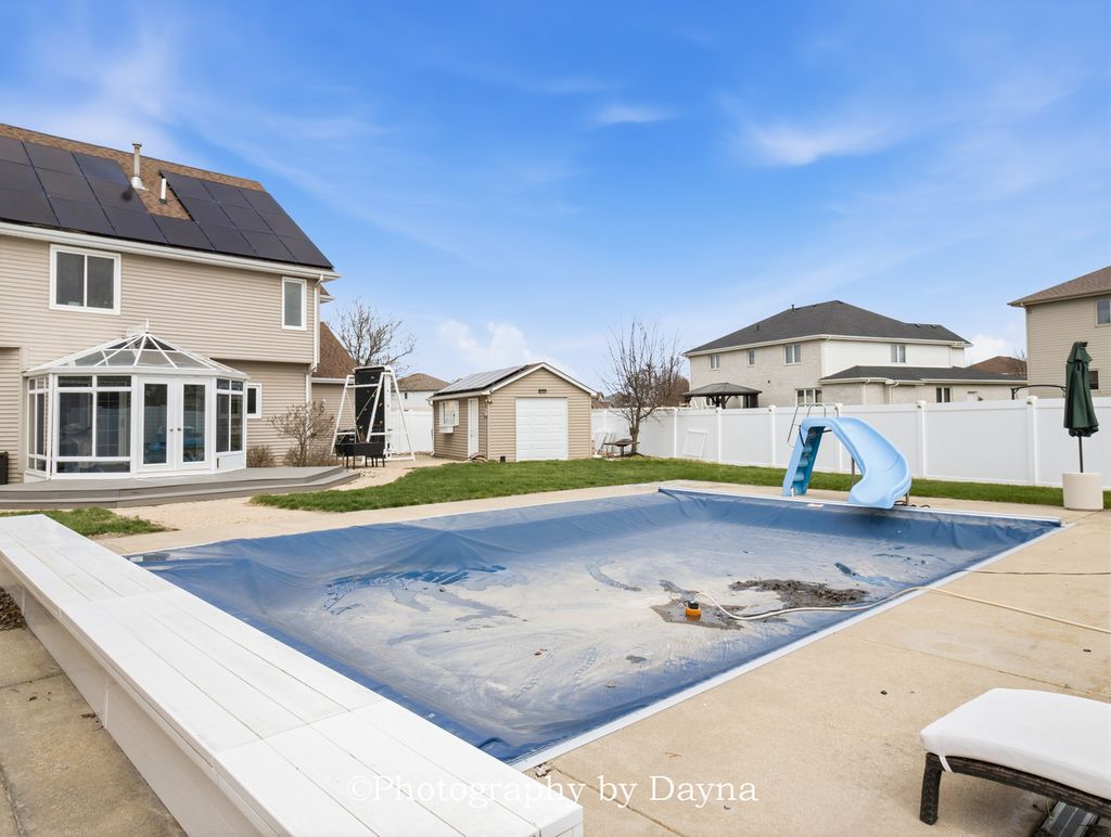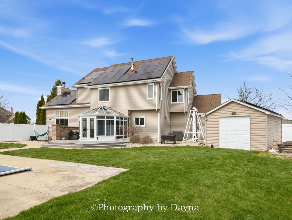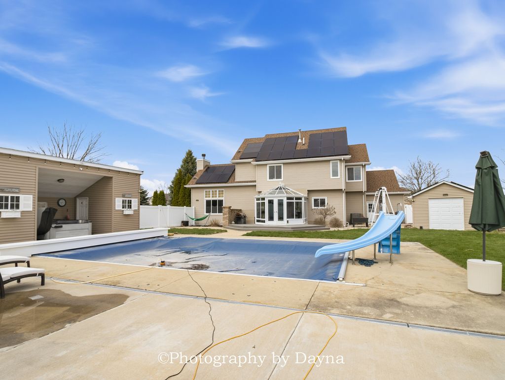 This custom-built home was meant for entertaining. You are greeted by a foyer that leads you're in a great room with cathedral ceilings and a floor to ceiling stone fireplace. The designer eat in kitchen with island, table space & a separate formal dining room. There is also a separate coffee and wine bar / frig. The main & second level features Brazilian Cherry hardwood floors throughout. Off the kitchen you will find a 3-season room that leads to your backyard oasis. The second level features custom master ensuite with WIC, and 3 oversized additional bedrooms. The lower level is finished with a family room, 5th bedroom (built in murphy bed) and a 4th bathroom. Your backyard oasis offers an inground pool w/slide, hot tub, additional 1 car garage for storage & a pool storage building. This home sits on a corner fenced lot- and also has a separate fenced area in the side yard - perfect for the kiddos & pets. Solar powered home - current electric bill runs $20 a month. ***The system is entirely paid for. (Level 2 car charger).*** This home if