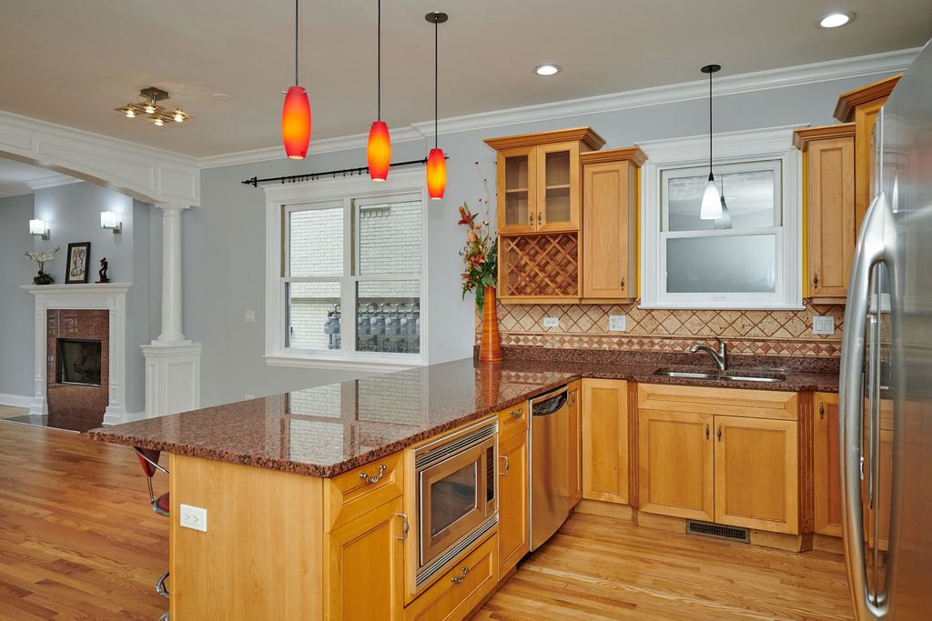 Welcome to this beautifully updated 4-bedroom, 3-bath duplex-down in the heart of Uptown, offering the space and comfort of a single-family home with approximately 2,500 sq. ft. of living space. Step inside to soaring ceilings, crown molding, and abundant natural light throughout the main level. Newly refinished hardwood floors lead to a spacious living and dining area centered around one of two cozy fireplaces, creating a warm and inviting atmosphere. The updated kitchen features granite countertops, stainless steel appliances, and a large island-perfect for everyday living or entertaining. The king-size primary suite offers a true retreat with three custom closets and a spa-inspired ensuite bath featuring marble finishes, a jetted soaking tub, and a steam-shower cabin. The expansive lower level provides exceptional living space with floor-to-ceiling windows, a large family room with a second fireplace, and a bar center ideal for gatherings. A private front patio extends the living space outdoors. Additional highlights include: large private deck with gas line for grilling, garage parking plus additional exterior parking space, ample storage with 10+ closets, dedicated exterior storage room (approx. 4' x 14'), large laundry room, two mailboxes - ideal for home office or business use. This highly desirable duplex-down layout offers generous space, beautiful finishes, and an unbeatable location near the lake and transit. Enjoy living steps from Uptown's vibrant dining and entertainment scene, including performances at the iconic Aragon Ballroom and Riviera Theatre, and live jazz at the legendary Green Mill Lounge. Everyday conveniences like Target, JewelOsco, and ALDI are just blocks away.