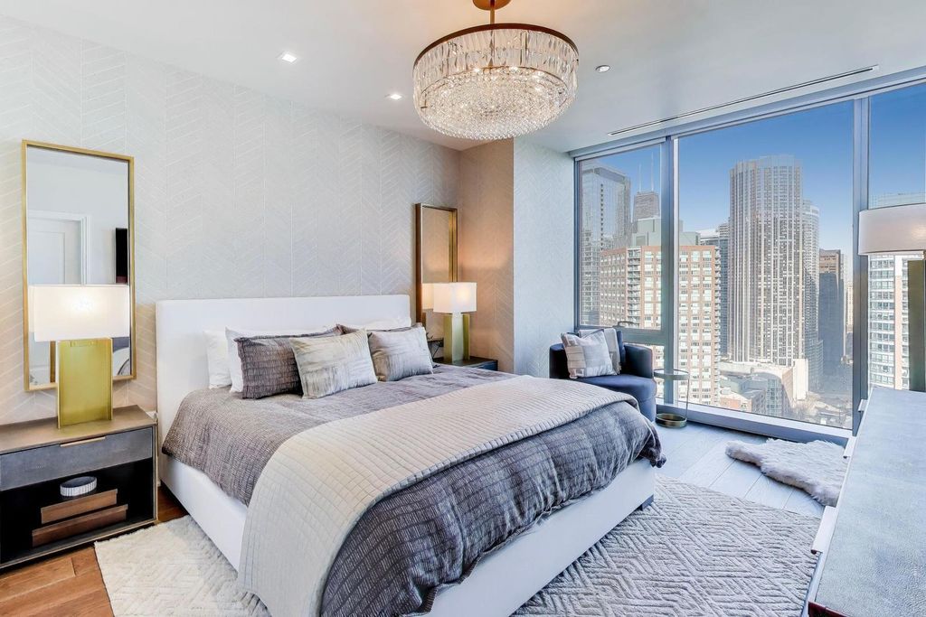 St Regis Residences 3 bed + den/2.5 bath corner unit with balcony located in Lakeshore East. An elegant bespoke residence offering sweeping north east city and river views in one of downtown Chicago's most sought-after luxury buildings. This beautifully maintained features floor-to-ceiling windows that flood the space with natural light, highlighting the open-concept living and dining area-perfect for entertaining or relaxing above the city. The elegant and modern kitchen is equipped with sleek cabinetry, high end appliances, and plenty of counter space. Remote blinds on all windows. Generous closet space throughout and spa-inspired bathrooms provides a serene retreat. In-unit laundry and thoughtful finishes complete the home. Residents enjoy full-service amenities including 24-hour door staff, fitness center, indoor and outdoor pools, hot tub, fire pit, private dining room, demo kitchen, private wine storage & wine tasting room, enclosed dog exercise area. Indoor attended parking included in the price. This is downtown living at its finest.
