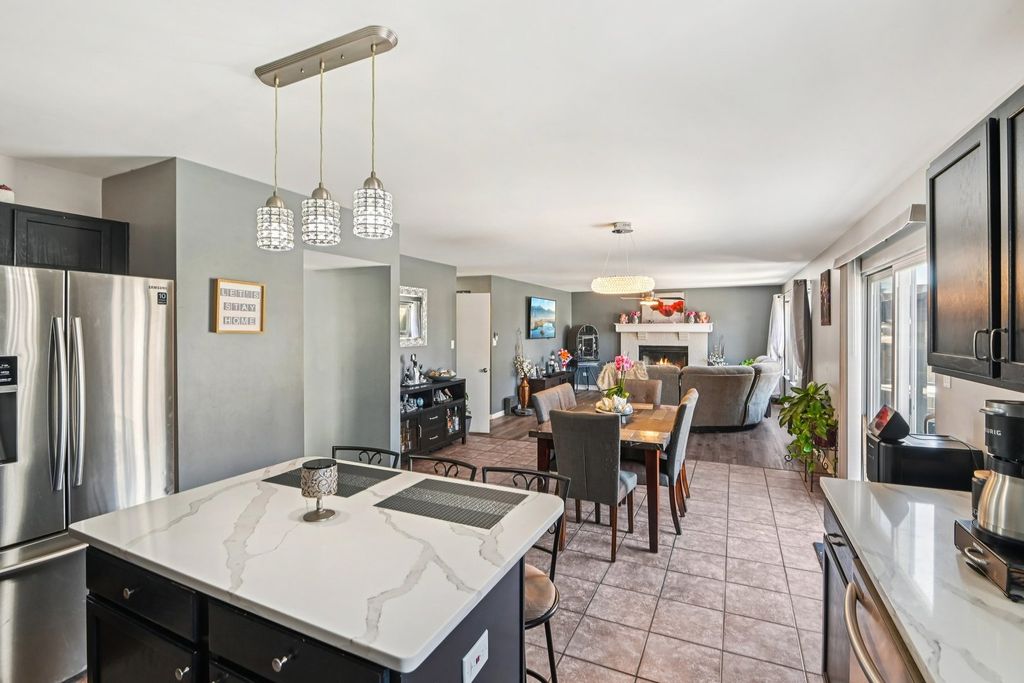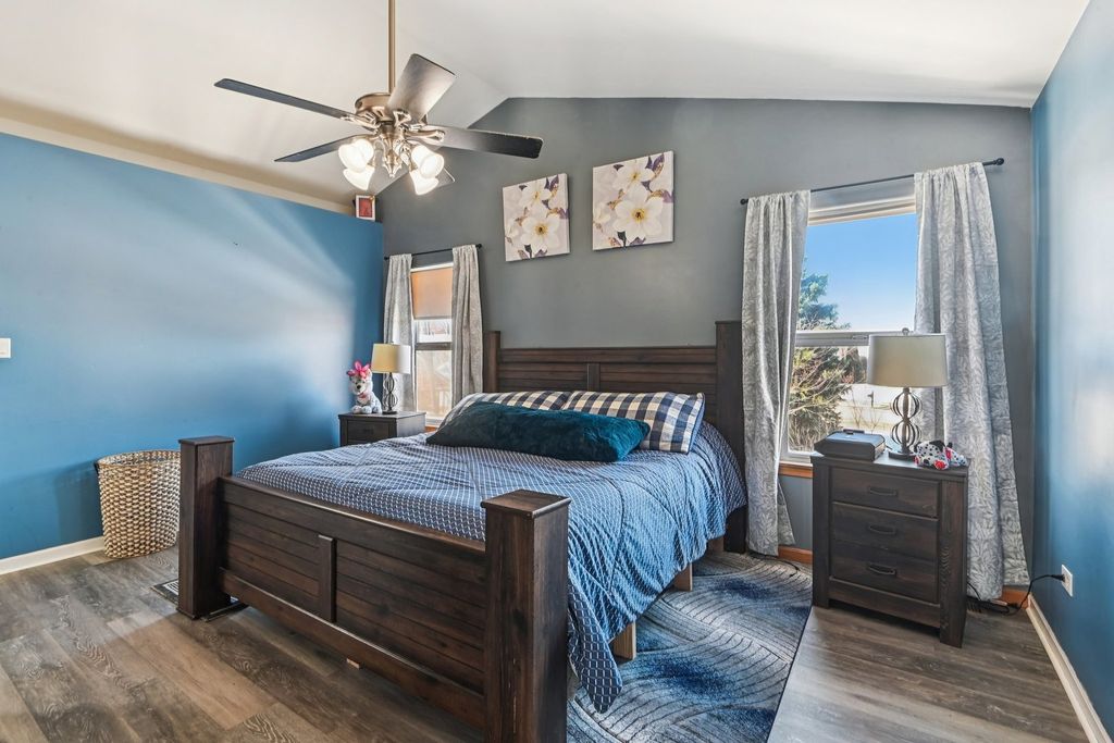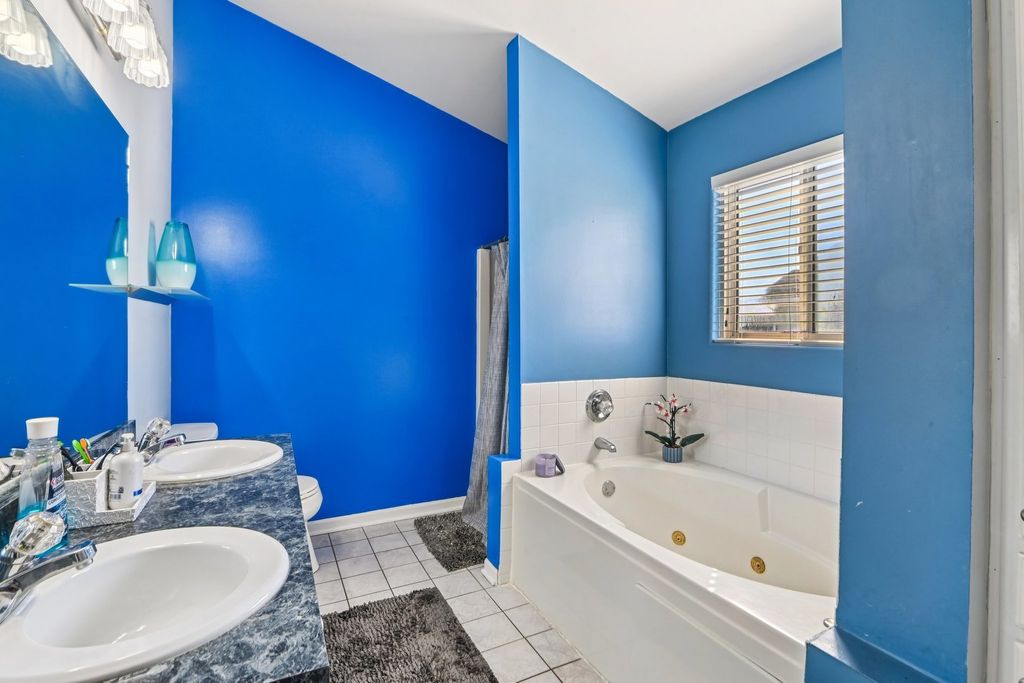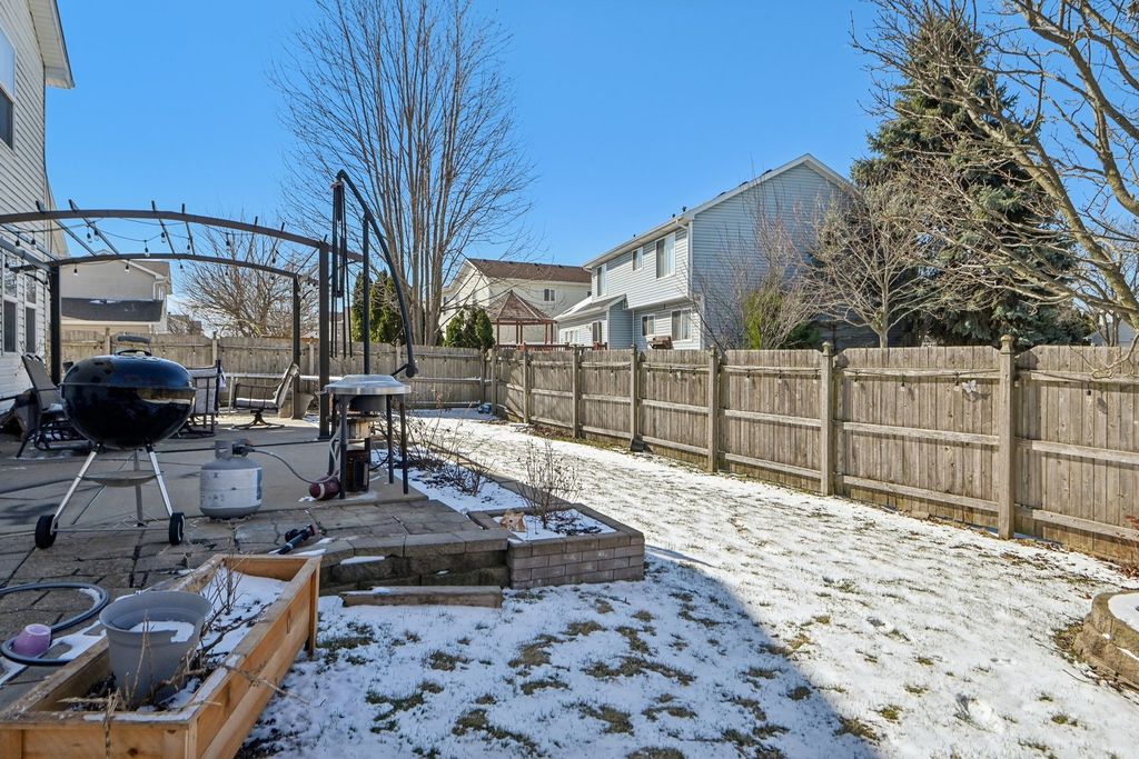 This stunning four-bedroom Plainfield home offers a perfect blend of space and sophisticated design. As you enter, the open living and dining combination impresses with soaring high ceilings and an abundance of natural light that flows throughout the main level. The heart of the home is the expansive eat-in kitchen, which seamlessly connects to the family room for an ideal entertaining layout. This chef-inspired space boasts a center island with seating, sleek quartz countertops, and stainless steel appliances. Adjacent to the kitchen, the inviting family room serves as a cozy retreat centered around a classic fireplace. Practicality meets style on the first floor with a dedicated laundry room and a convenient powder room. The second level opens to a versatile loft that provides excellent additional living space. The primary suite is a true sanctuary, featuring high ceilings, a cooling ceiling fan, a generous walk-in closet, and a luxurious ensuite bathroom. This private spa-like bath includes a double vanity, a soothing jetted tub, and a separate walk-in shower. Three additional well-proportioned bedrooms and a shared full bathroom complete the upper floor. For even more room to grow, the partially finished basement offers a spacious recreation room along with ample storage solutions. Outside, the fenced backyard provides a private oasis featuring a patio perfect for summer gatherings, all complemented by an attached two-car garage.