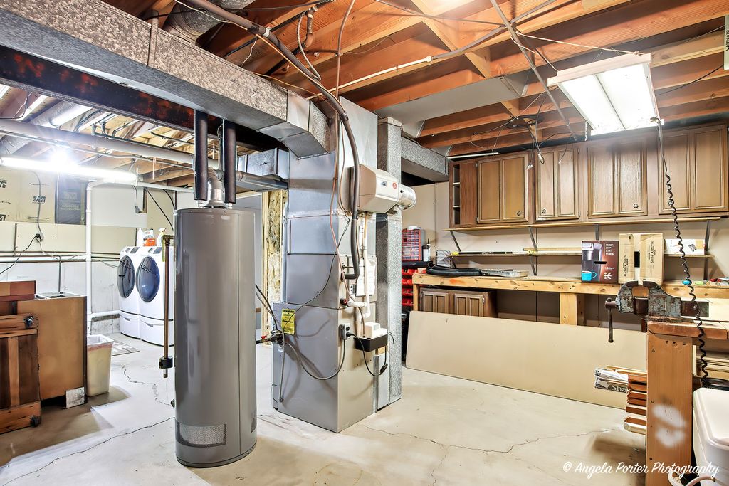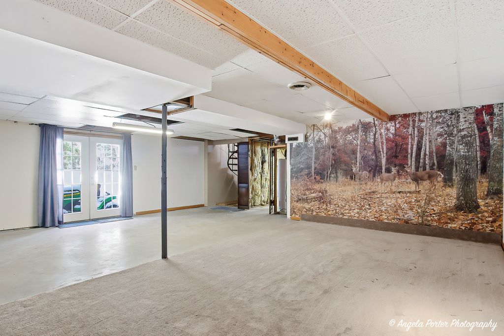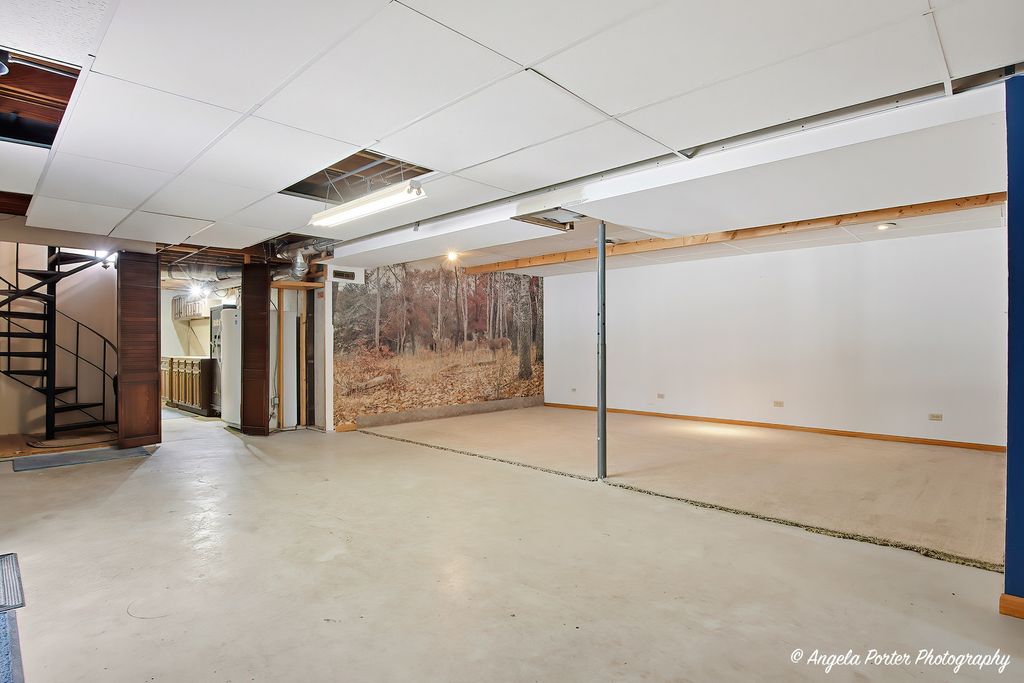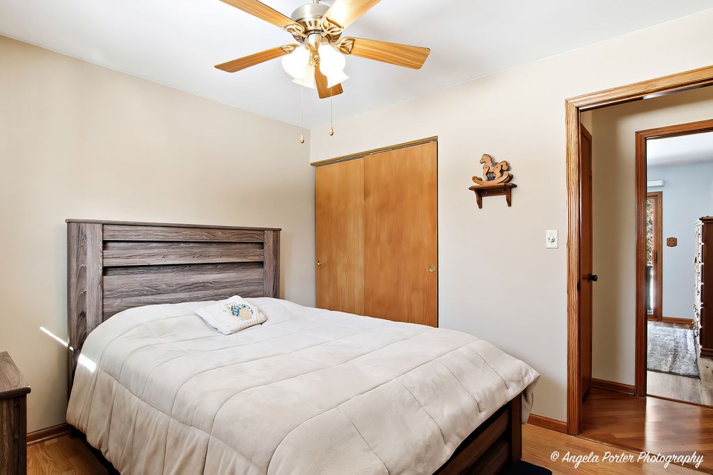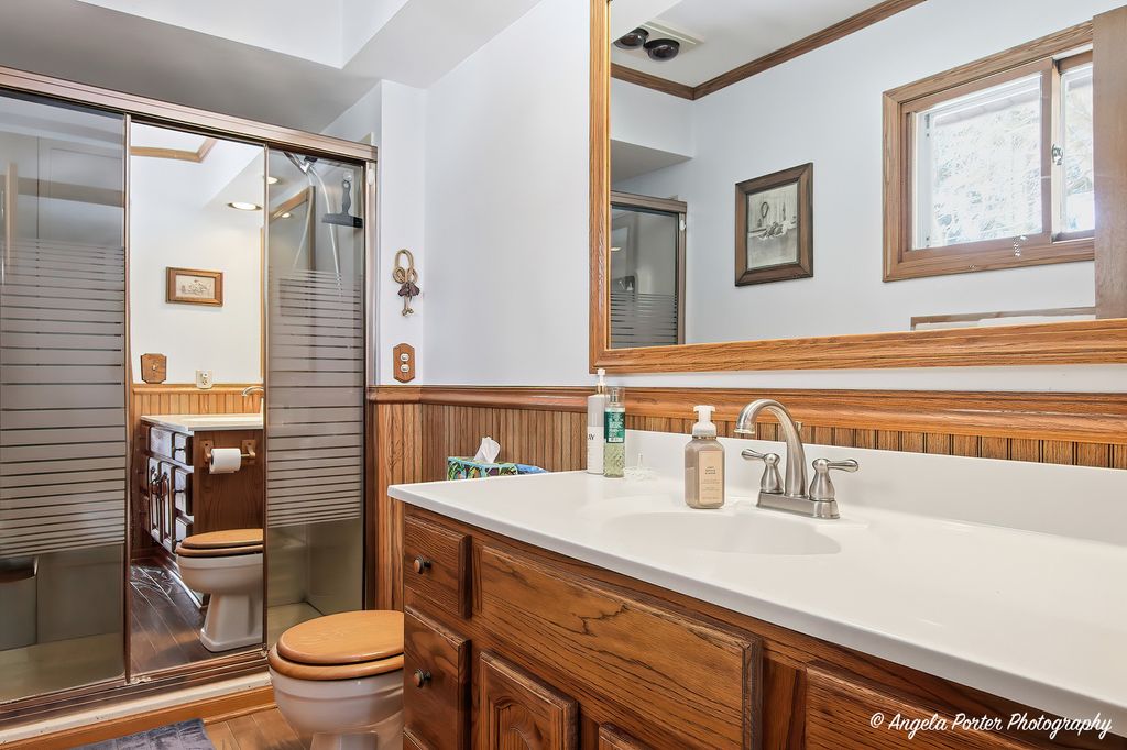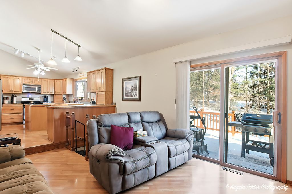 Most ranches at this price point have a postage-stamp lot and a one-car garage. This one in McCullom Lake has .35 of an acre fenced with mature trees, a walkout basement, and a wood-burning fireplace that actually heats the room. The living room earns its place. The fireplace pulls the whole space together on a cold night, and the sliding glass door opens to a deck with a wooded backyard that makes you want to keep it cracked even on shoulder-season evenings. The house is oriented well for natural light, and the flow between the living space and the outdoors feels effortless. The kitchen faces the backyard through a bay window above the sink - so whether you're making coffee at 7am or cleaning up after dinner, you've got a view worth having. Oak cabinets, a center island, and real counter space make this a kitchen that gets used, not just photographed. The 15x13 dining room next to it gives you room to breathe. The primary bedroom has its own full bath. Two more bedrooms and a second full bath complete the main level. Wood laminate floors run throughout and the ranch layout means everything is on one level - accessible, practical, no surprises. The walkout basement changes the math on this house. A 25x20 rec room opens directly to the backyard, a dedicated laundry room, and a 17x11 storage room that actually holds things. Unfinished - so it becomes whatever you need it to be.