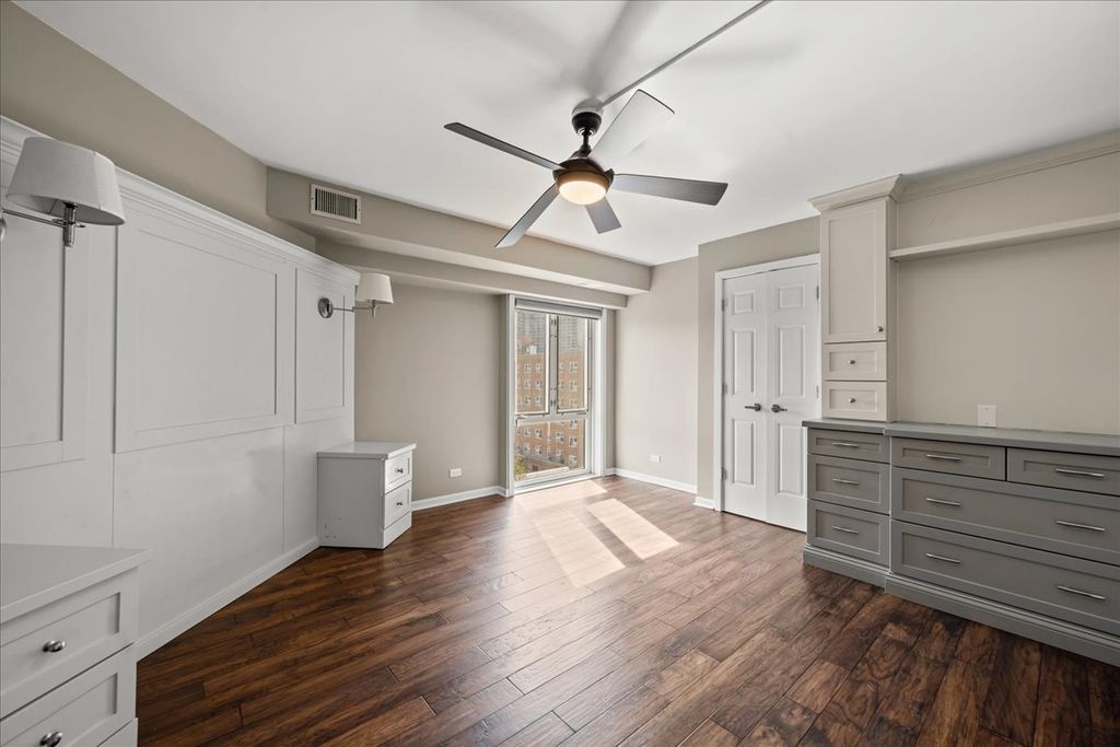 Sun-drenched, fully renovated 2BR/2BA condo just steps from the lake in desirable Lakeview Terrace. Prime location across from Northwestern University, one block to Whole Foods, and two blocks to Clark Street Beach. This beautifully updated home features hardwood floors, custom built-ins, and a private balcony with serene treetop views. Spacious primary suite with large walk-in closet and spa-like bath. Renovated eat-in kitchen with granite countertops, stainless steel appliances, and a walk-in pantry unique to this unit. Flexible second bedroom with custom built-ins-ideal for guests or home office-with adjacent full bath Split-bedroom floor plan offers exceptional privacy. In-unit laundry, heated garage parking (1 space), and additional storage included. Garage slated to be electric-ready in 2026. Well-maintained elevator building with low taxes and HOA. Move-in ready and enjoy the best of lakefront and in-town living. No Rentals allowed