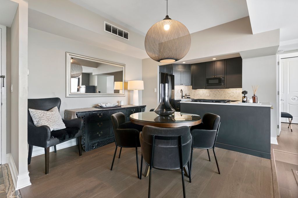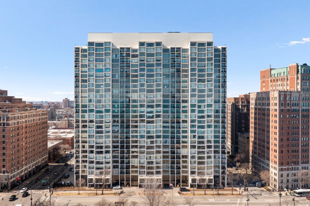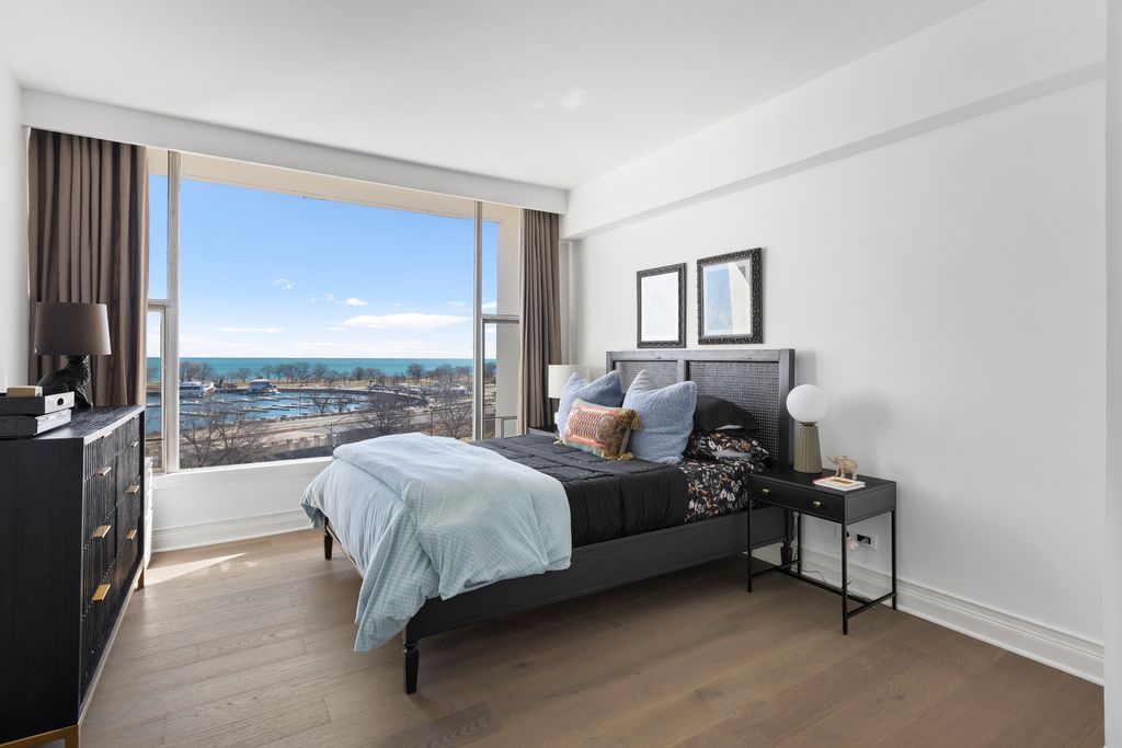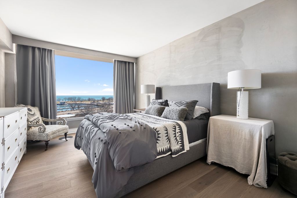 Interior designer-curated 2BR/2BA split floor plan with wall to wall and floor to ceiling windows allow for breathtaking, unobstructed Lake Michigan views at the full- amenity Harbor House building on Lake Shore Drive. This unit masterfully blends clean modern living while keeping the building's mid-century soul. The main living space was transformed by opening up the foyer, dining room and kitchen to the sunken living room giving all spaces a full view of the lake while flooding the home with natural light. Newly installed, wide-plank, gray-washed oak flooring throughout creates a clean and seamless backdrop to the purposefully chosen statement upgrades - a vintage travertine mantle pairs with a sleek bio-ethanol fireplace and solid black granite surround, a classic, airy Mooi chandelier defines the dining room area and the fully redesigned kitchen (2021) showcases Kraftmaid cabinetry in a greige sharkskin finish, burnished brass, knurled hardware, hands-free faucet, paneled dishwasher, GE refrigerator with in-door water and ice, quartz countertop and built-in microwave. The remodeled primary suite bathroom features limestone floor and walls, an extra linen closet, walnut vanity with Kohler vanity lit medicine cabinet mirror above, Kohler Laura Kirar fixtures, Kohler heated toilet seat, soaking air tub, and a thoughtfully re-plumbed layout. The adjoining bedroom features full lake views, a walk-in closet and a neutral micro-suede wallcovering, giving the space a rich, enveloping warmth. The guest bath equally impresses with marble tile walls, Kohler fixtures, steam shower, porcelain tile floor and exceptional built-in storage throughout. Garage parking available and storage locker included. Ideal location in East Lake View close to the lakefront path, restaurants, shops and public transportation. Building amenities: 24- doorperson, on-site management, indoor lap pool, fitness center and community room.