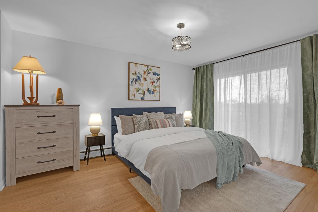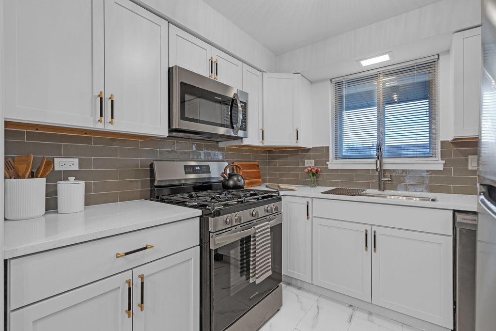 Top floor, sunny, freshly updated two bedroom in booming Portage Park. Open floor plan includes a separate dining area off a new, modern kitchen with white shaker cabinets, sharp backsplash, quartz counters, and Frigidaire stainless steel appliances. Stylish bath with two separate vanities. Hardwood floors have been refinished throughout, all lighting and plumbing fixtures are updated. Huge primary bedroom has abundant closet space and access to a balcony overlooking a private courtyard. Large second bedroom has a spacious walk in closet. Well run 24 unit building with laundry room on premises, large storage locker and a parking space(#7) included. Heat, hot water and cooking gas included in a very reasonable assessment(no People's Gas bill). This spacious home is like new and move in ready, you will love it!