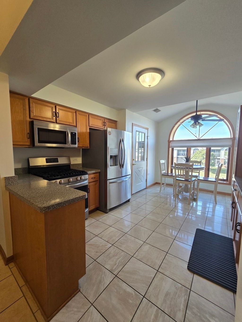 Welcome home to this beautifully maintained 2-bedroom, 2-bath condo in the highly desirable Misty Pines community of Tinley Park. Offering the perfect blend of comfort, style, and peaceful surroundings, this home is truly move-in ready. Step into a bright and airy living room featuring soaring vaulted ceilings and an abundance of natural light that instantly makes the space feel open and welcoming. The adjacent dining area mirrors those vaulted ceilings, creating an ideal setting for entertaining or enjoying everyday meals. The spacious eat-in kitchen is both functional and stylish, complete with maple cabinetry, stainless steel appliances, a convenient breakfast bar, and a charming transom window that fills the space with light. The oversized primary suite is your private retreat, featuring vaulted ceilings, a walk-in closet, and a spa-like en-suite bathroom with a soaking tub, separate step-in shower, and maple vanity. The generously sized second bedroom offers easy access to a full hall bath, also finished with a step-in shower and maple cabinetry. Enjoy your morning coffee or unwind in the evening on your private enclosed balcony overlooking serene pond views. Additional storage is conveniently located at the end of the balcony. This unit also includes a one-car attached garage and an in-unit laundry/utility room. Major updates include a newer roof and a water heater replaced in 2020. Ideally located just minutes from shopping, dining, downtown Tinley Park, I-80, and the Metra Rock Island line, this home offers both convenience and lifestyle. With low assessments and taxes, it's an incredible value. Misty Pines is a 55+ community; however, this unit includes a rare under-55 allowance, making it a unique opportunity for younger buyers. Don't miss your chance to own this meticulously cared-for home in a wonderful community. Sold as-is.