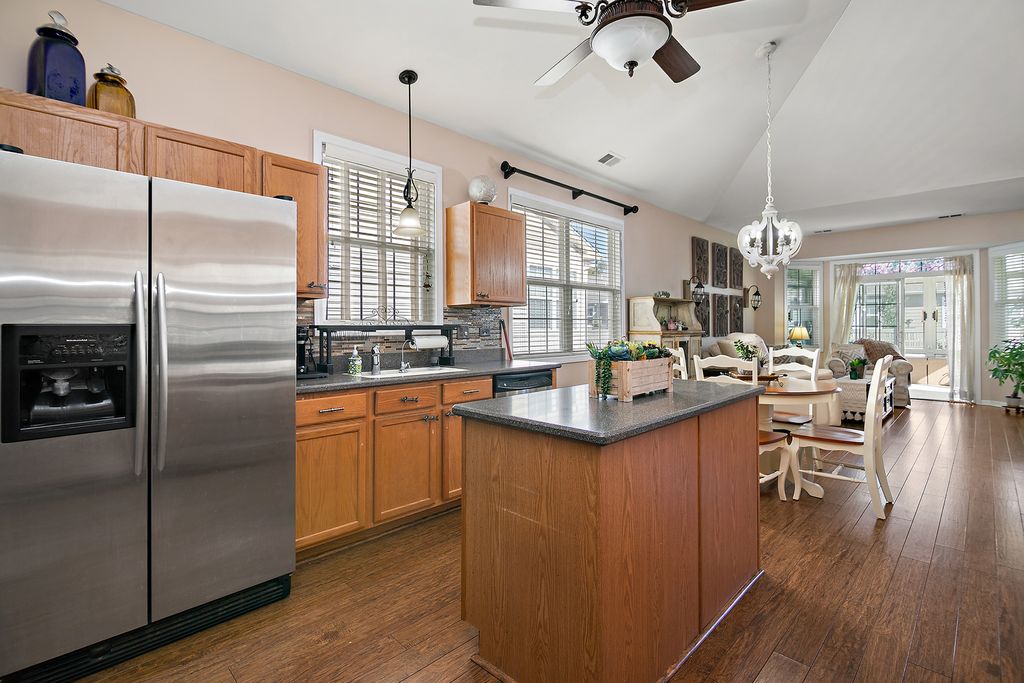 Welcome to this beautifully maintained and rare ranch in the sought-after Lago Vista 55+ gated community! Offering approximately 2,016 sq ft, this home features an open floor plan with soaring 12+ ft cathedral ceilings and wood laminate flooring throughout the main living areas. The spacious kitchen includes stainless steel appliances, a large island, and an eat-in area that flows into the family room and bright sunroom with access to a private yard. The expansive primary suite offers vaulted ceilings, double closets, and a private bath with walk-in shower. A home office adds flexibility, and the second bedroom sits near a full guest bath. This home also offers solar panels for added energy efficiency, which can be transferred to the new owner or removed by the seller. Enjoy resort-style living with a clubhouse, pools, walking paths, and social activities. A rare opportunity in Lago Vista!