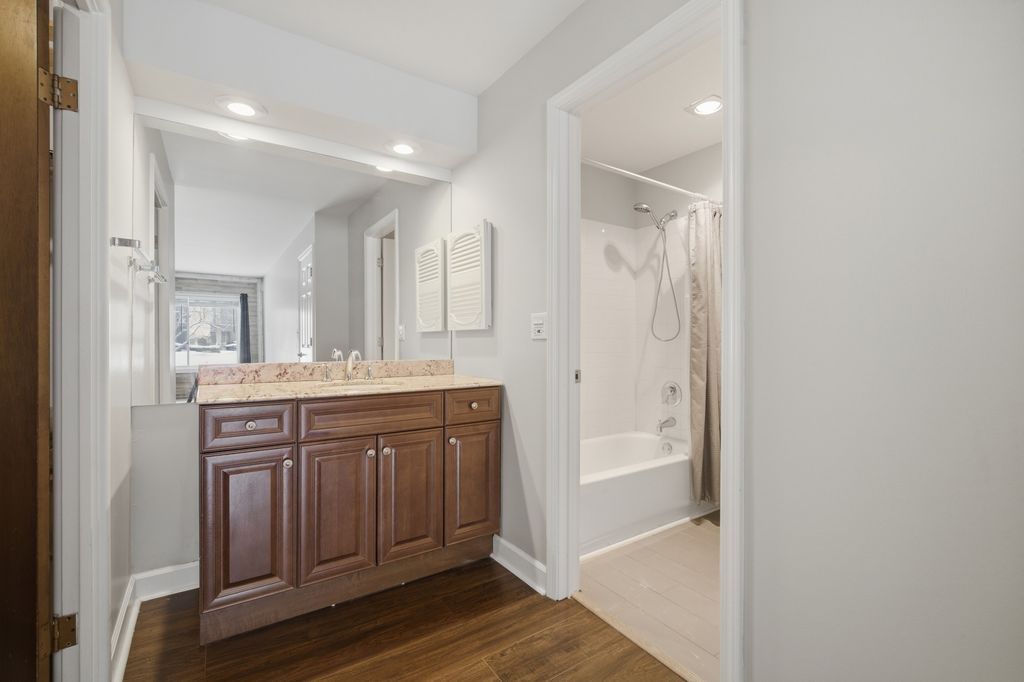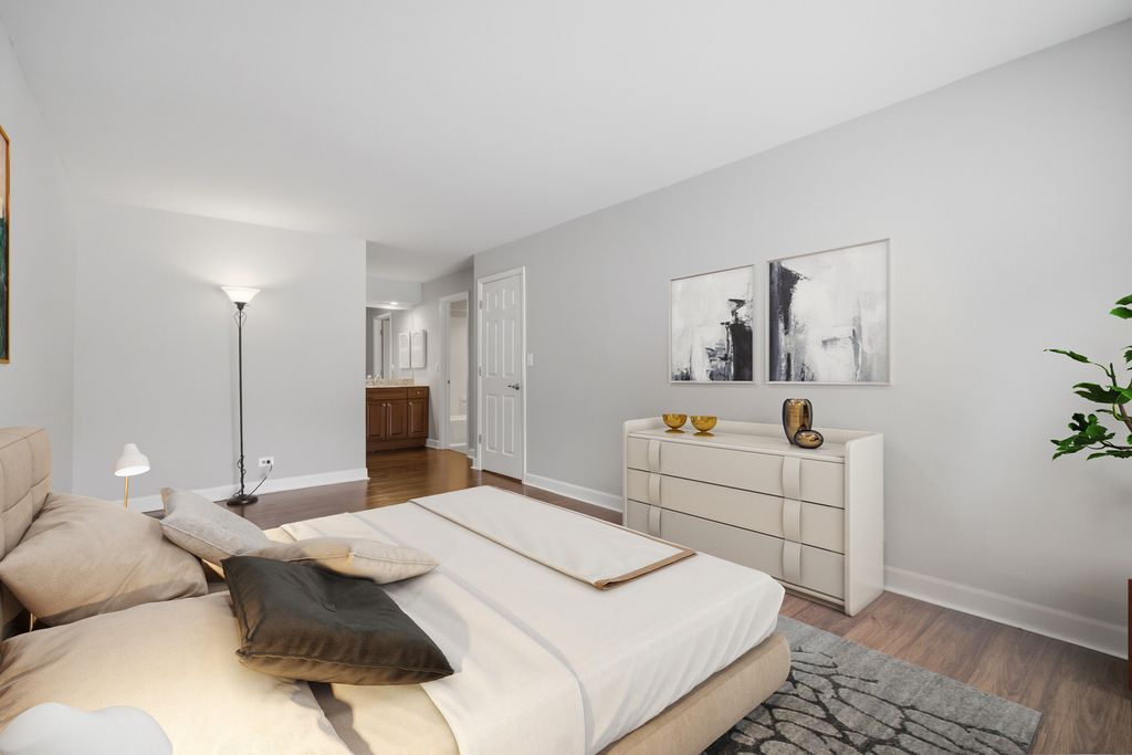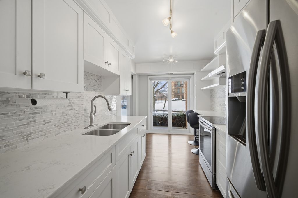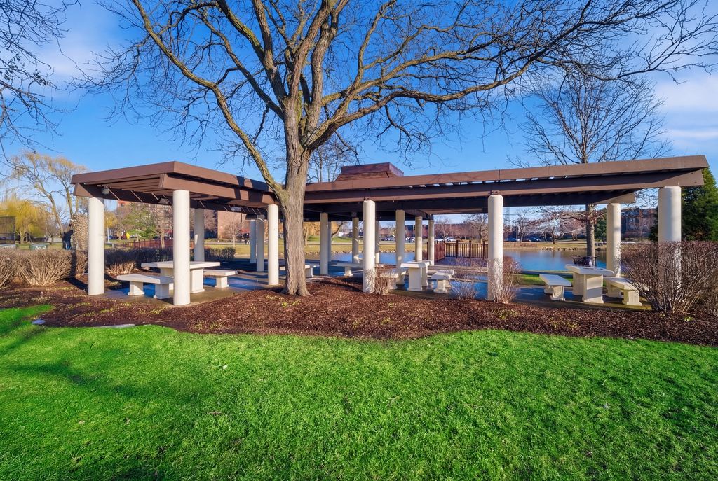 Do not miss this 2 bed 2 bath condo at the desirable Hunt Club On The Lake in Mount Prospect! This first-floor unit offers dark laminate floors throughout, a large living space with a beautiful stone electric fireplace, space for a designated dining area, and a walk-out patio overlooking the park-like grounds and tennis courts. The updated galley style kitchen offers white shaker cabinetry, quartz countertops, stainless steel appliances, and breakfast bar seating. The freshly painted guest bedroom offers built-in wardrobes, custom shelving, a convenient desk area, tons of natural light, and crown molding. The expansive primary bedroom features a walk in closet, granite top vanity, and ensuite bath. The unit includes one heated garage space #90, additional exterior parking, storage locker #129, and access to the bike room. The secure elevator building offers excellent community amenities including scenic walking and biking paths around the ponds, an outdoor pool, clubhouse, and tennis courts, all in a beautifully maintained setting close to Kopp Park, The Mount Prospect Park District, shopping, dining, and public transportation. No rentals or pets allowed.